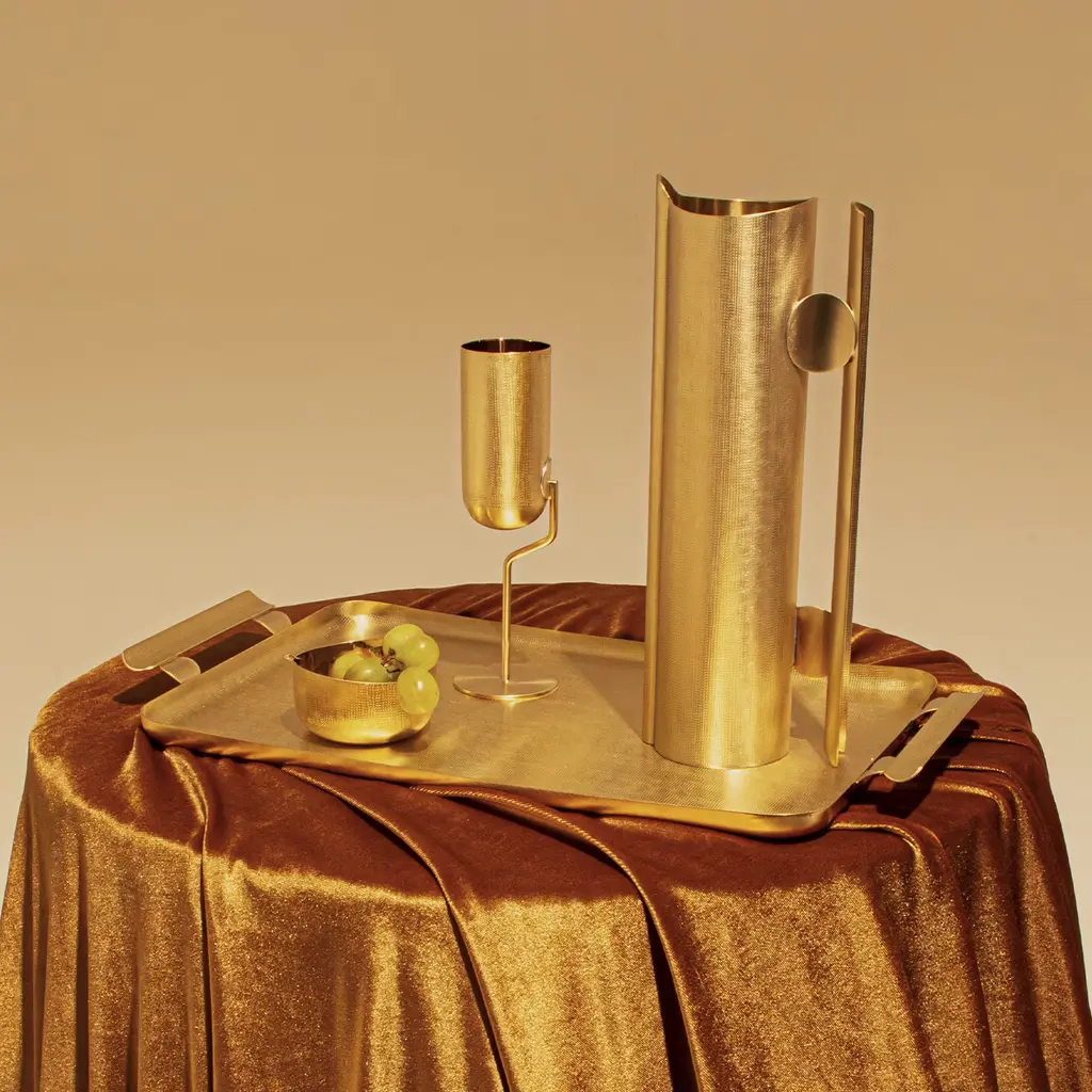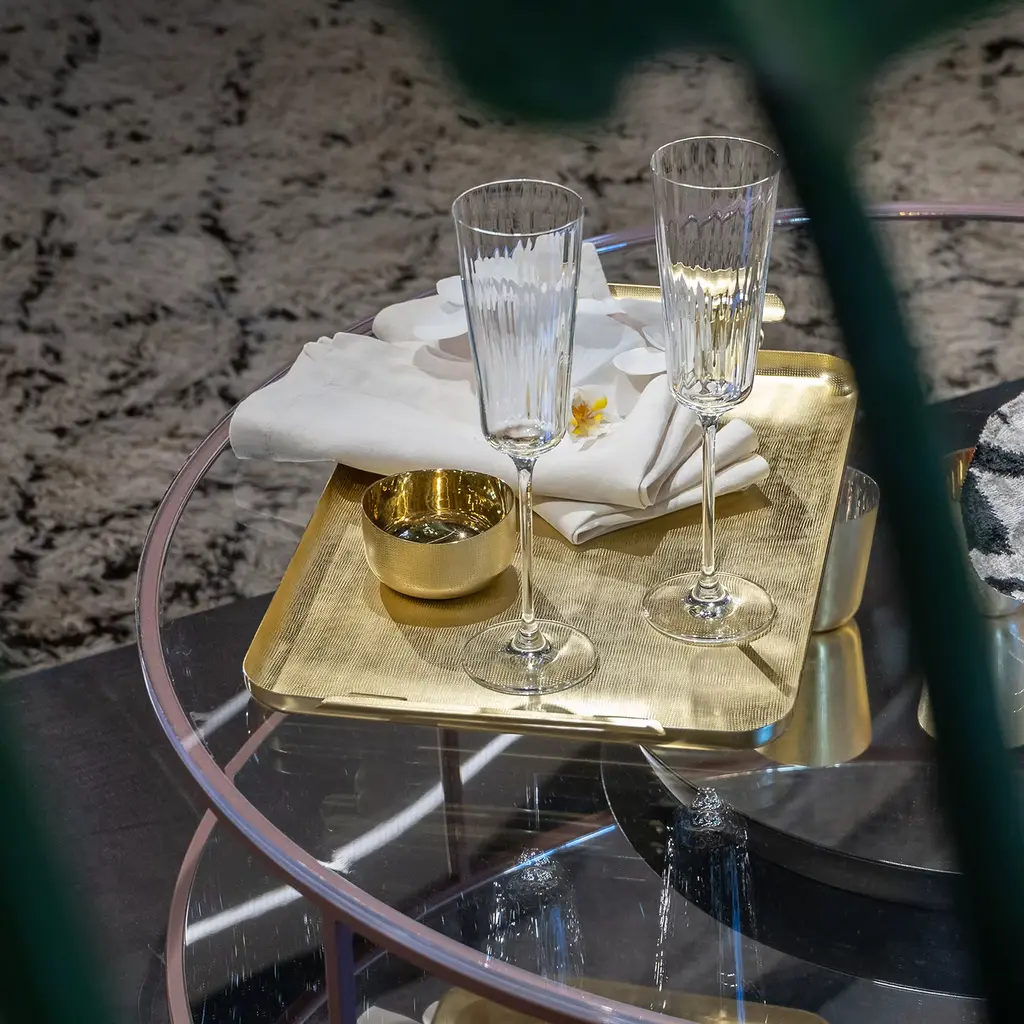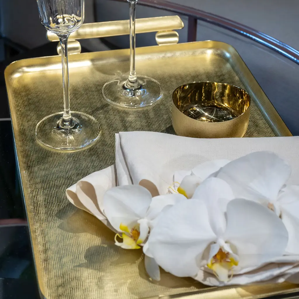 When brass and texture become Velvet for table jewels, for an exceptional mise en place. The brass is worked with the unique Zanetto know-how and special hammering to obtain a surface that is like velvet to the touch. Called “light gold brass” due to the resistance and the stainless property that this special work gives to the material.