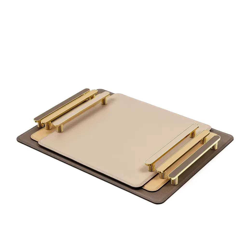 Echoing the splendor of the Palace of Venaria - antique royal residence of the House of Savoy - this tray channels luxury and refinement. The flat rectangular frame with rounded corners is wrapped in light-brown-hued leather, prized material also accenting the linear handles completed by spring-like elements with a glossy gold finish (also burnished or chromed on request to the Concierge). A superb housewarming gift.