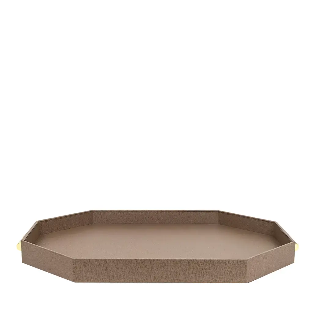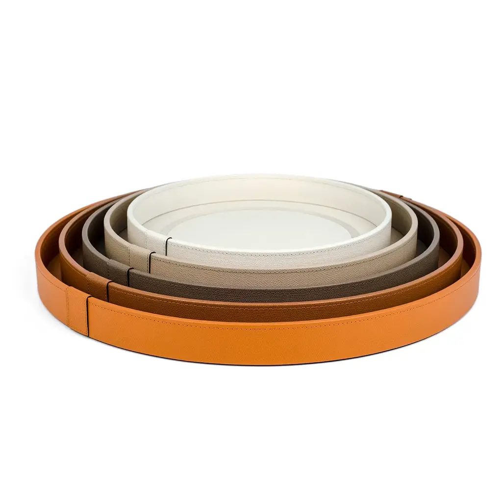 This elegant tray is made of a structure in wood that was elegantly upholstered with caramel calfskin, only interrupted by a thin, chromed ring accenting the bottom. The round shape, the warm hue, and the smooth leather all lend this piece a sophisticated allure and make it ideal to complement residential and professional contexts, alike. Please contact the Concierge for available color and size variants. Also available without chromed details (Gea Collection).