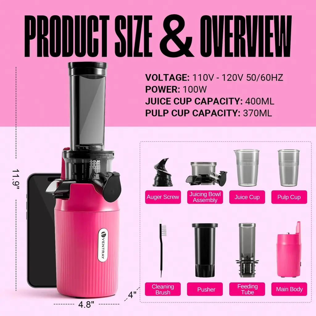 Ventray Essential Ginnie Juicer, Compact & Slow, Nutrient Dense - Small - Pink