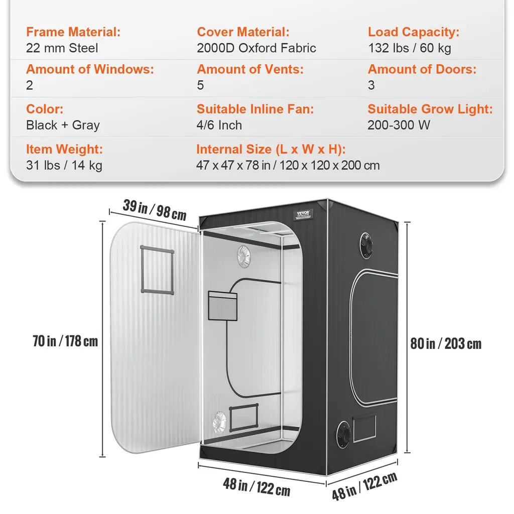 Quick Installation: VEVOR's advanced grow tent is built with robust 22 mm steel for a stable structure that can support up to 132 lbs. It features easy-to-assemble metal connectors, saving you time. Extra thickened triangular layers prevent it from breaking, ensuring durability. Lightproof Design: Our indoor grow tent is upgraded with wider and thicker strips at every seam to block out light completely. The premium SBS zipper ensures smooth and durable use, even with frequent openings and closings. High-Quality Material: Made of tear-proof 2000D Oxford Fabric, it offers higher density and superior light blockage compared to 600D. The tent's inner layer is constructed from 100% Reflective Mylar, creating an ideal growing environment for your plants. User-Friendly Features: The 4 x 4 ft growing tent comes with visual windows for easy plant observation, surrounded by 40mm Velcro to prevent light leaks. It includes a detachable floor tray and tool bag for convenient maintenance and immediate use. Versatile Use: Embark on your indoor planting journey with VEVOR's hydroponic grow tent, suitable for garages, balconies, and homes. Pair it with VEVOR's 200-300 W grow light and 4/6 inch inline duct fan (not included) to achieve optimal planting results. Package Content: 1 x Grow Tent 2 x Hanging Strap 1 x Floor Tray 1 x Handy Mesh Bag