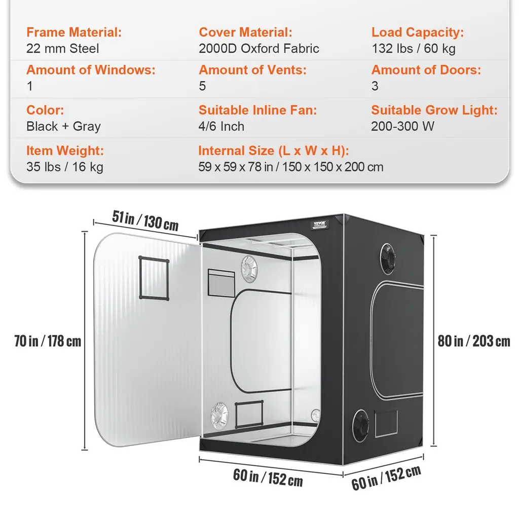 Vevor 2X4 To 10x10 Grow Tent 48"x24"x72" To 60"x60"x80" 2000d Mylar Observation Window Tool Bag Floor Tray For Indoor Plants - 60" X 60" X 80" - Grow Tent - Plastic