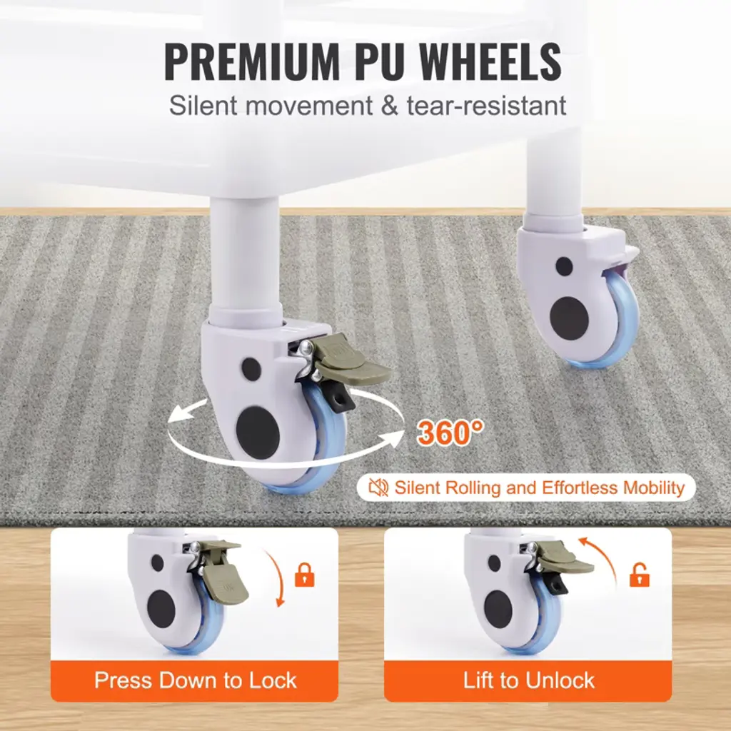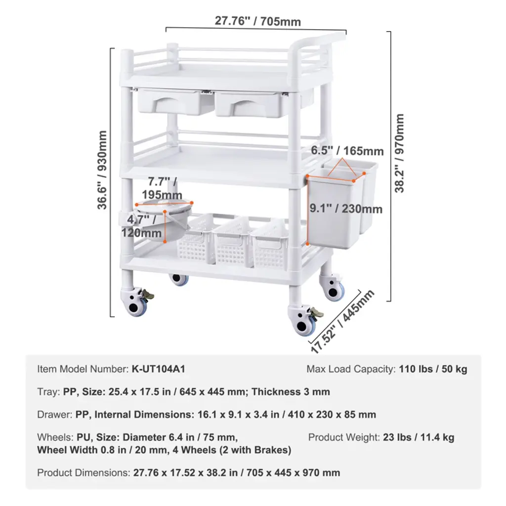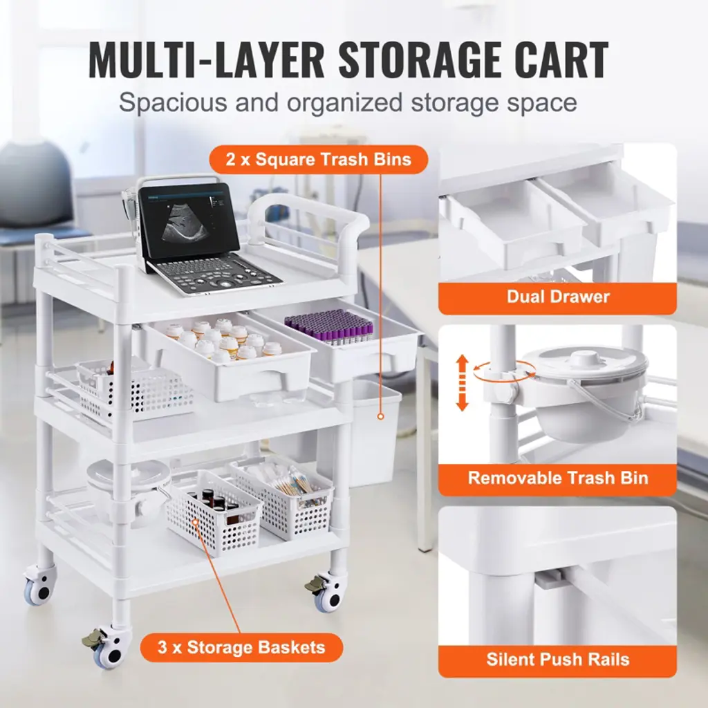 Feature: Stable Load Bearing: Designed to securely hold medical equipment, this lab cart not only boasts a robust weight capacity of 110 pounds but also features a widened top tray to ensure safe and stable placement of your medical devices. The anti-slip edges further enhance stability and safety of items. Efficient Storage: With multiple layers and ample capacity, the lab utility cart efficiently organizes various supplies. The top tray and lower drawers offer rich storage space, making it easy to organize and store various medical and laboratory supplies. The unique drawer design, equipped with hidden silent rails, ensures privacy and convenient access. Durable Material: Excellent impact and chemical corrosion resistance ensure the medical cart remains like new for long periods, reducing maintenance costs. Made from high-density ABS material and reinforced with internal steel plates, VEVOR's cart withstands wear and impact in daily use, ensuring long-term reliability. Comfortable Handling: The ergonomic handle provides a comfortable grip, making pushing effortless. Equipped with 4 silent, wear-resistant wheels including locking rubber wheels, it offers stable and quiet pushing whether moving straight or maneuvering flexibly. Flexible Adaptation: Whether in busy hospitals, professional laboratories, or home care settings, this rolling lab cart adapts easily, providing convenient storage and transport solutions. Its wide application range makes it the preferred choice for healthcare professionals, nurses, beauticians, and others. Package Content: 6 x 4-hole Guardrail Sleeve 6 x 2-hole Guardrail Sleeve 2 x Sleeve Interface 4 x Threaded Connecting Pipe 4 x Nut Connecting Pipe 1 x Handle 12 x Short Guardrail 6 x Long Guardrail 1 x Covered Trash Can 1 x Trash Can Bracket 3 x Storage Basket 2 x Square Trash Can 1 x Instruction Manual