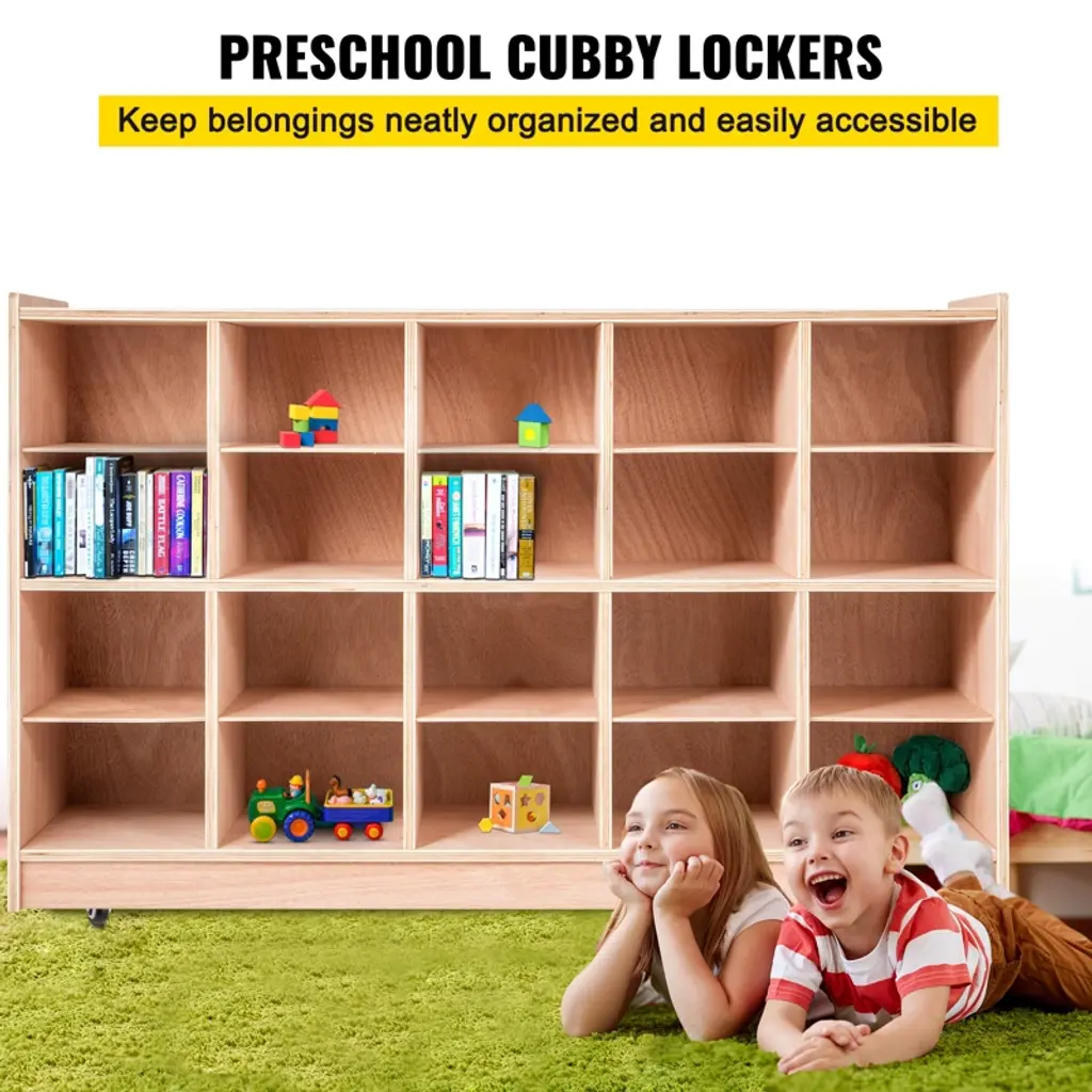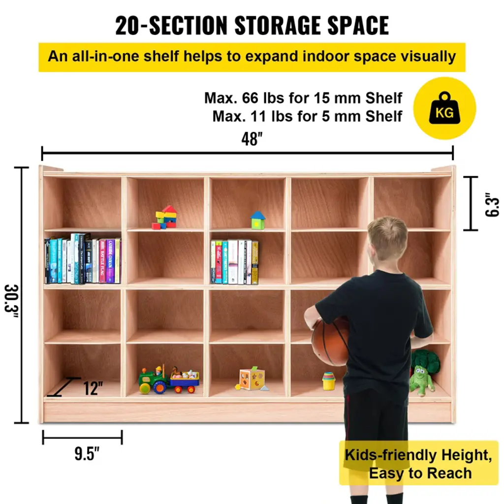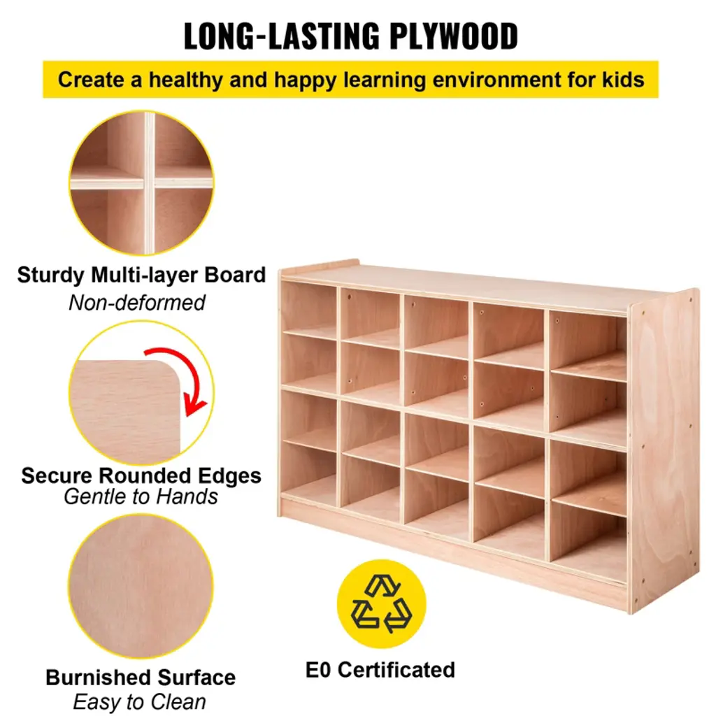 Feature: Organized Storage: Start with our cubby mobile tray storage cabinet for a tidy and organized space. Give toys, books, and other items a designated place, making it easy to tidy up and keep life organized. Easy to Use: Make every child's growth journey easier and more enjoyable with our cubby tray cabinet. Designed at the perfect height for kids, they can easily access and put away items, fostering independence and making growing up fun. Safe and Considerate: VEVOR 4 x 5 wood cubbies are designed with safety and durability. With rounded edges, our cubes ensure children are safe during use, giving parents peace of mind. High Quality Material: Crafted from durable particleboard and poplar wood, this tray cubby storage offers reliable strength and stability, enduring the daily wear and tear of children's activities, and accompanying them through their growth. Develop Good Habits: With a simple design, our wood kid storage cubby not only enhances children's spatial awareness but also encourages kids to participate joyfully in organizing their belongings, fostering self-reliance and cultivating good habits. Package Content 1 x Cubby Tray Storage Cabinet 4 x Wheels 1 x Flat Wrench 2 x Anti-theft Device 1 x Instruction Manual