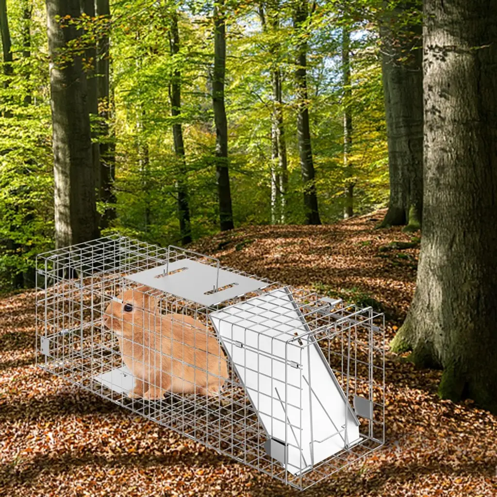 Feature: Wide Application: As urban and wilderness ecosystems intertwine, animals may disturb your life. Our cat trap is a versatile solution for various animals, including cats, raccoons, rabbits, groundhogs, armadillos, and opossums. It effectively addresses issues such as farmland invasion, release, and harassment. Humanized Designs: We prioritize humane care with our raccoon trap. The L-shaped lever ensures the trap won't harm animals when triggered. The dense mesh prevents escapes and protects against external attacks or stolen food. Smooth wire edges prevent animals from panicking or biting the wire, ensuring their safety. Sturdy and Durable: Our animal trap is built to last. It is constructed with sturdy, thickened wires that withstand animal bites and impacts without deformation or cracking. The galvanized coating provides excellent corrosion resistance, ensuring stability and durability in all weather conditions. Simple and User-friendly: Our live trap is designed for your convenience. It comes pre-assembled, saving you from tedious setup steps. Just unfold the cage, secure the rear door, and connect the trap mechanism to start using it quickly. This saves time and effort, allowing you to engage in capture work promptly. Portable and Easy to Store: Our efficient groundhog trap is portable and easy to store. It features a convenient handle for easy mobility, with an extended design that prevents accidental injuries from animals. The collapsible design allows for easy storage, freeing up space when not in use. Package Content 1 x Live Animal Cage Trap 10 x Nylon Strips