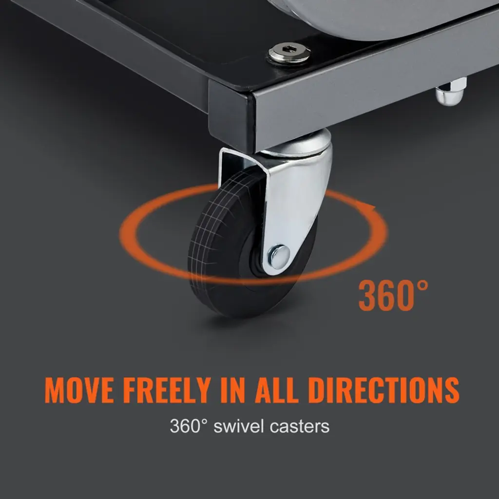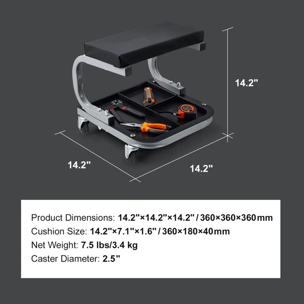 Feature: Heavy-duty Mechanic Stool: VEVOR's garage stool is constructed from a thickened tubular steel frame, which will not deform easily and ensures countless usage for years. Casters are fixed with locknuts and thread glue, and the bearing capacity is up to 250 lbs/113 kg. The rolling shop stool is heavy-duty and difficult to roll over or tilt backward. Move with Ease: Equipped with 4 pcs 2.5"/6.35 cm 360° universal casters, the workshop stool can be flexibly steered even on complex surfaces. Ball-bearing PP casters feature a compression mechanism and are wear-resistant. Smooth movement on different surfaces. Sit Comfortably: You won't feel tired after sitting for a long time due to the wide padded seat. The PU surface is waterproof and oilproof, and it is easy to clean with one wipe. While repairing or washing your car, you won't have to worry about the seat getting dirty or wet. Store Your Tools Orderly: Enjoy more control with the large capacity tool tray under the bottom that allows you to store different items. Three partitions can better classify tools and parts of various sizes. Keep your devices within reach and save time. Say goodbye to running back and forth in your workspace. Are you ready to get more done? Broad Applications: 14.2"/36 cm height makes the garage stool a perfect choice for repairing or cleaning vehicles, furniture, and other low projects. Lightweight design allows you to use it anywhere you need, such as garages, roadsides, homes, etc. Work anywhere, comfortably! Package Content: 4 x Plate Nut 6 x Screw 4 x M8 Lock Nut 1 x M6 Wrench 4 x M8 Flat Washer 4 x M8 Spring Washer 1 x User Manual