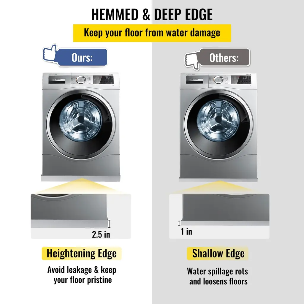 32'' x 32'' / 32'' x 30'' Spacious Size: A buildup of water on your floor can create unsightly water spots and give off a foul smell over time. Our 32'' x 32'' / 32'' x 30'' washing machine drain pan can keep your valuable floors from condensation, leaks or overflow. It features the perfect size for most types of washing machines.Thick & Durable Stainless Steel Pan (32'' x 32'' option) / Galvanized Steel Pan (32'' x 30'' option): Are you looking for a heavy-duty washing machine pan? Our washing machine drip pan has your back covered! This pan is made from heavy-duty stainless steel / Galvanized Steel, providing capabilities to withstand abrasion and corrosion. Hassle-free to Assemble: The washing machine pan can be installed under the washer and then connected directly to the drainpipe. Our washing machine pan comes with a pre-cut hole and a 0.59" PE drain adapter. The pre-drilled hole is for labor-saving assembly, so you don't need to drill a hole by yourself and buy other accessories. Welded & Heightening Edge: A leaking washing machine will impose risks and threats. If a hose leaks or ruptures, it will release gallons of water per hour. Once you finally detect the leak, it might cost a significant amount to leverage the situation. Our 2.5-inch high-edge design will eliminate your concerns, avoid leaks, and keep your floors clean and dry. Wide Applications: A washing machine pan can safeguard the floor and the nearby surroundings against the overflow of water, leaks, and spillage. In addition to being suitable for washing machines, it can also be installed under dryers, dishwashers, refrigerators and so on. Package Content 1 x Washing Machine Pan 1 x PE Drain Adapter