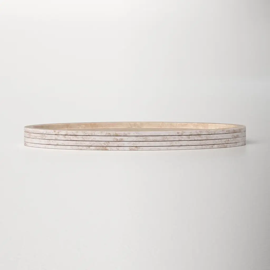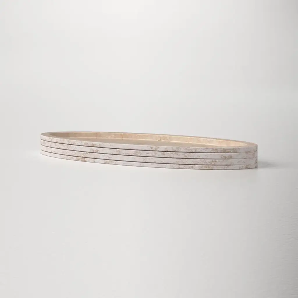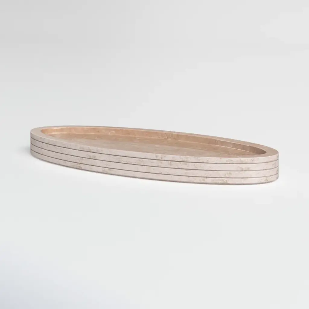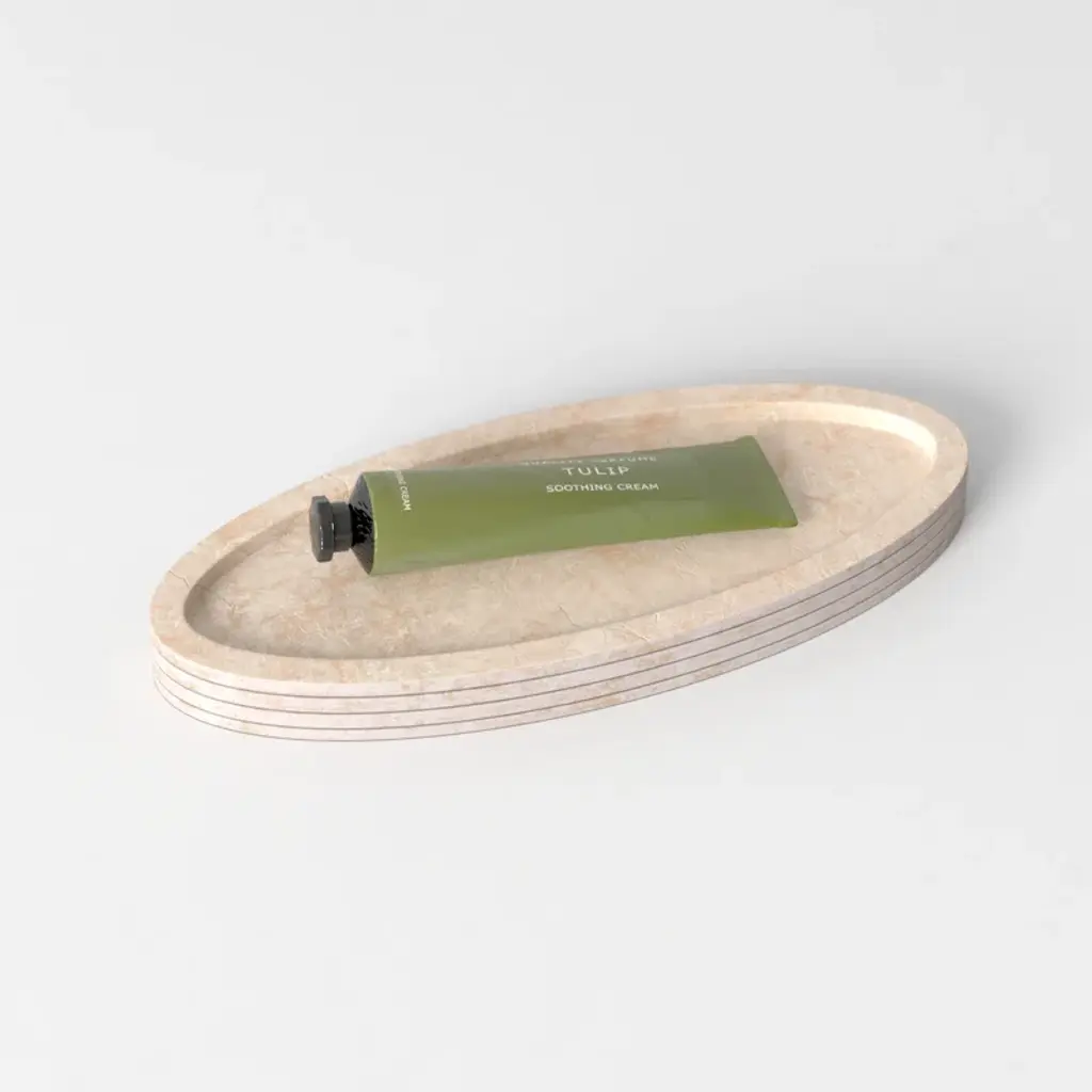 Tidy + textural. Crafted from natural limestone and travertine, this accessory tray’s clean lines and organic graining are accented by tactile ribbed edges. It unclutters your counter + keeps small items from vanishing down the drain, while bringing an earthy, grounded vibe to your bathroom.