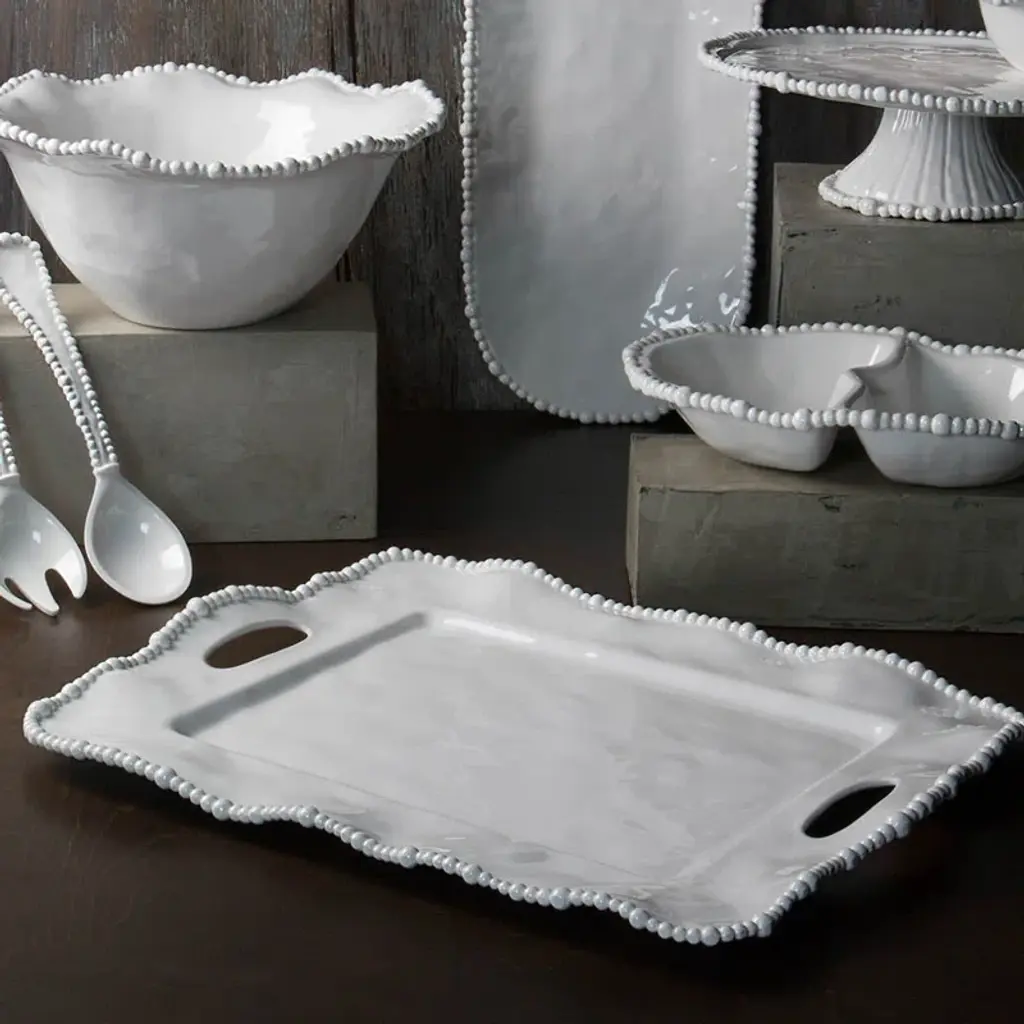 An ample serving area and notched handles make this sparkling white rectangular Tray with handles a shining star in our innovative Alegria collection, a luxury melamine line designed with distinctive Beatriz Ball flair. Fabulous for passing around snacks or drinks, the tray also makes a statement placed on the bar or kitchen island. Perfectly suited for indoor and outdoor entertainment, this Alegria tray is designed for everyday enjoyment. Pair the tray with other white melamine pieces for a coordinated serving set, or mix and match with items in four other colors for a festive and vibrant table display. Pairs well with items from Beatriz Ball’s signature metal line, too. Having the substance, weight, and appearance of ceramics, this white melamine tray is as beautiful as it is versatile. Makes a unique gift.