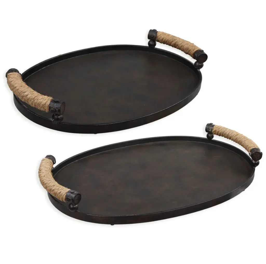This Set Of Iron Trays Is Finished In A Rustic Oxidized Bronze Finish With Natural Rope Wrapped Handles. Sizes: S-19x3x13, L-22x3x15