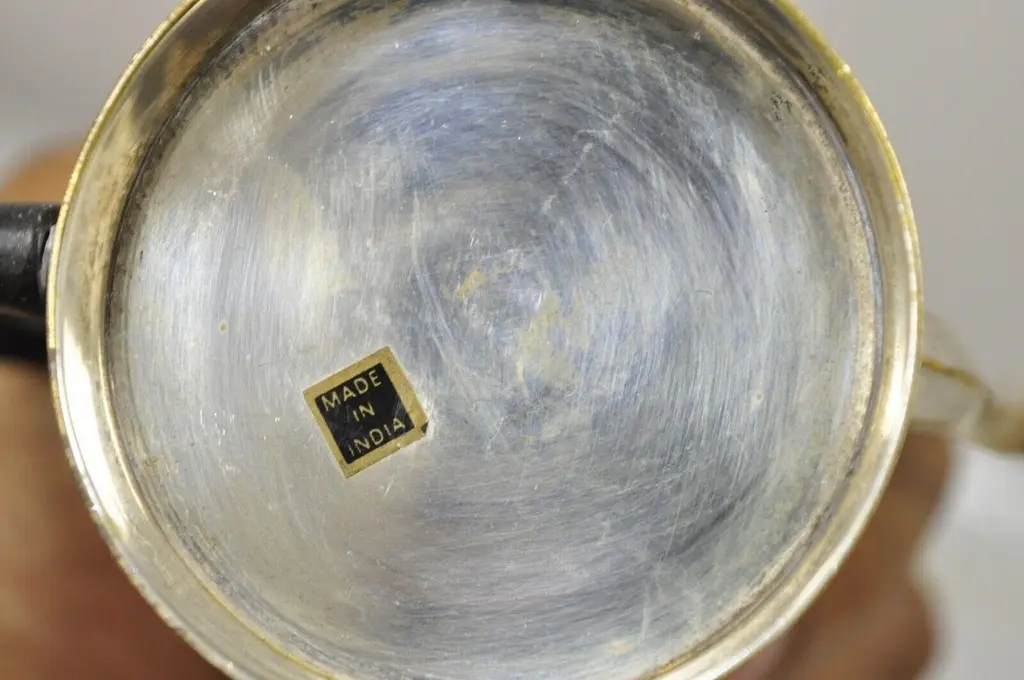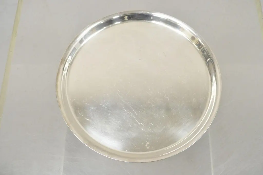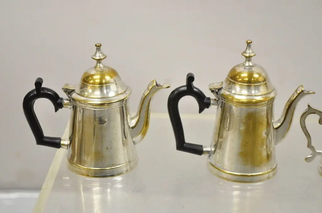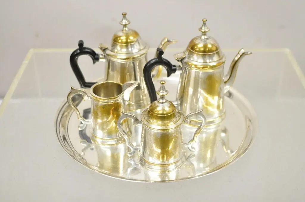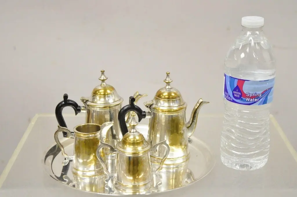 Vintage Federal Style Small Indian Silver Plated Coffee Tea Set w/ Wilcox Tray. Item features a 5 piece set, serving pieces marked "Mad in India", round tray marked "Wilcox international silver Co 209", black plastic handles, unique small vintage set.Circa Mid to Late 20th Century. Measurements: 5" H x 5" W x 2.5" D ,Tray: 9.25" Round.