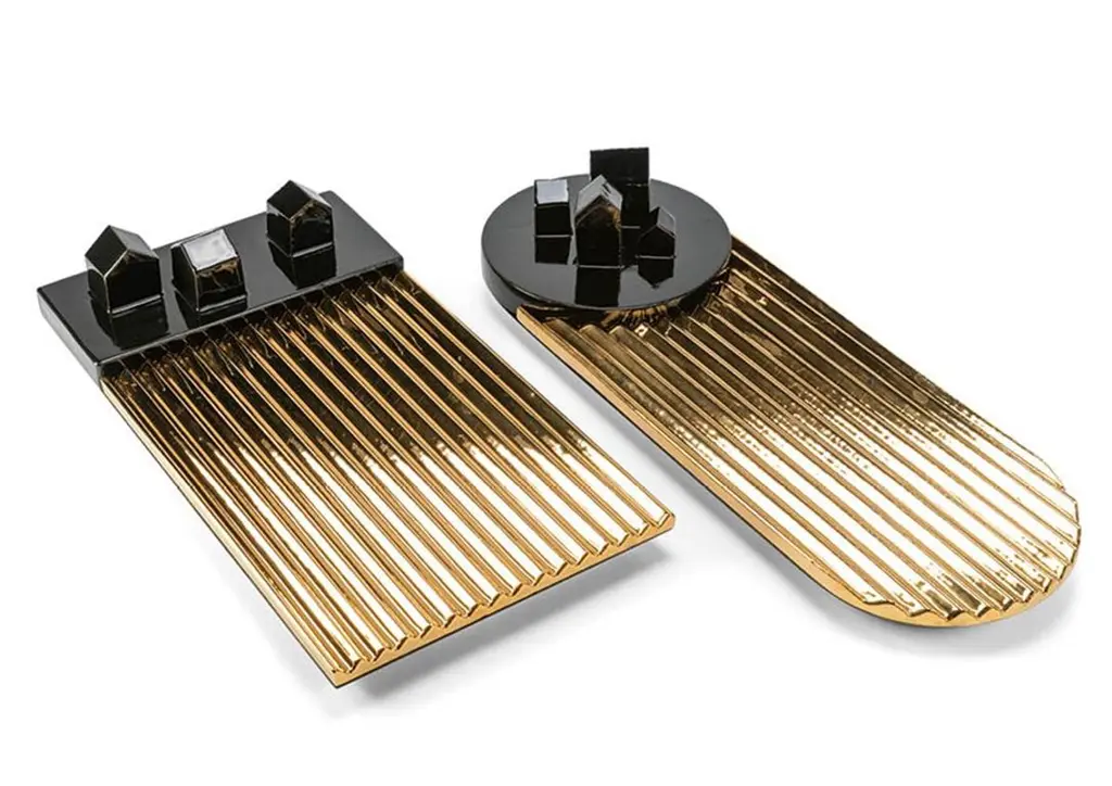 The volume that contains the houses, joined to the zigzag top, suggests the image of a rural landscape in which we can glimpse the furrows of tilled land and the dwellings of the farmers. The gold finish of the top underscores the value of the land, of cultivated fields. Each object is made by assembling three parts: two in glazed ceramic, with gold, third fired and a support in painted waxed plywood. Considering the completely handmade approach used in every phase of the production, without multiple reproduction methods, every piece has slight differences in terms of measurements and appearance. Each item should be considered a “one-of-a-kind” creation.