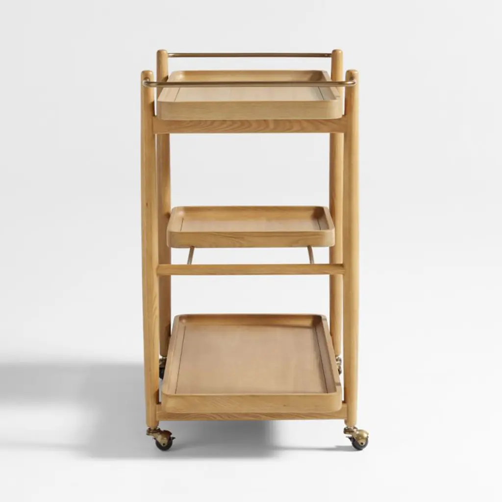 Our Vitae bar cart goes on the move to deliver cocktail-hour refreshments right where they're needed. Equipped with caster wheels, the cart nods to mid-century modern design with tapered, pillowed legs and a mix of burnished brass hardware and richly grained elm. Tray-edge shelves provide lower storage for beverage bottles, cans and glassware, and a top work surface is perfect for mixing and serving. In the center a small tray slides on rails to make room for taller bottles and is easily removed for additional serving options.
