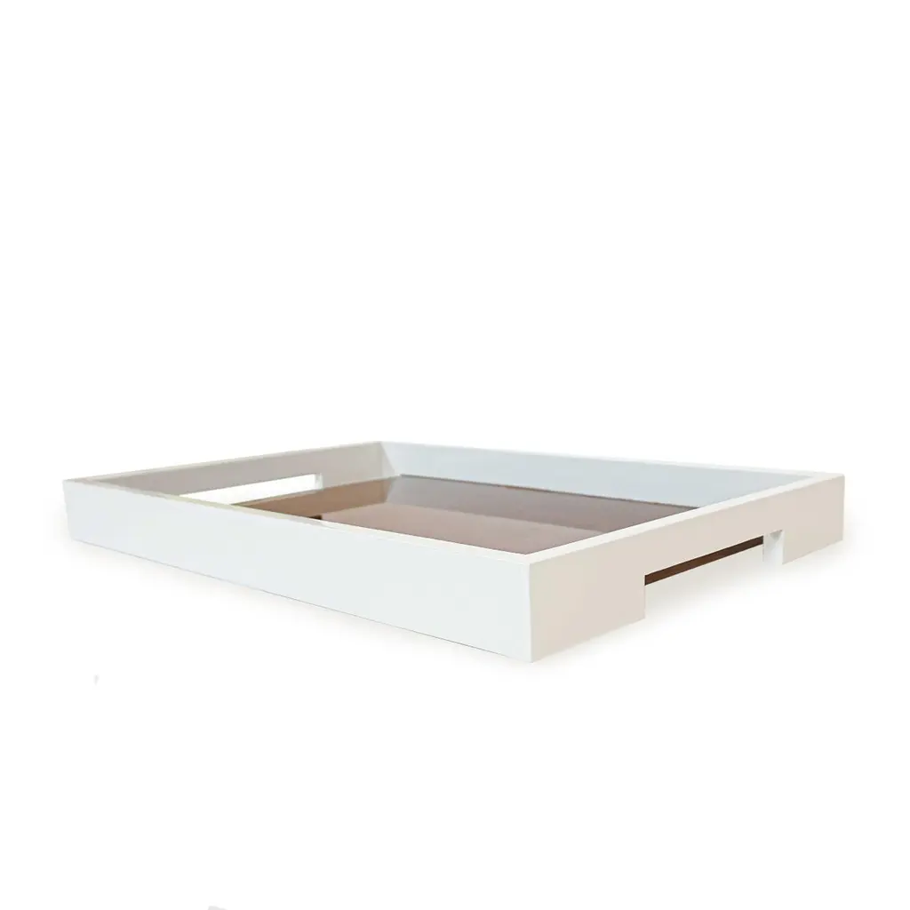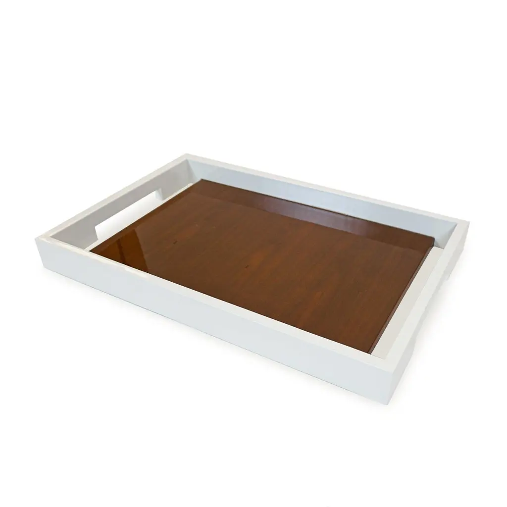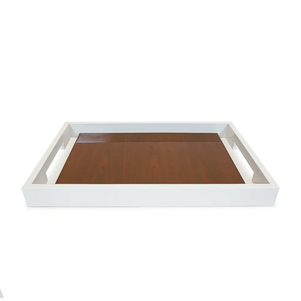 White lacquer tray made from solid hard maple features a contrasting Walnut Center. Perfect for displaying collectibles or as a serving piece. Tray can be customized in size, lacquer and wood species and finish. Customization may change price. Measurements:Outside: 26.5”W x 17.5”D x 2”HInside: 22”W x ”D x 1.03”HPrice shown: $730 eachCustomization may change price.How we work:Made to order by Connecticut-based furniture design and manufacturing company The Tailored Home. After orders are placed our workshop manager creates a visual work order for your approval for quality assurance.Customization options:Dimensions can be customized. The fabric shown may come in more colors. We also carry thousands of other materials and can send you samples and fabric pricing upon request. We accept your fabric for a COM fee of 5% of the cost of the piece. Welting, piping, tape or trim can be added. Different species available for pieces with exposed wood and can be painted & lacquered in any Benjamin Moore color (for additional charge) or stained in one of our stain options. Custom color matches cost $75 per sample.We accept inspiration photos of pieces you like.