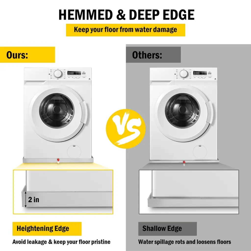 Heavy Duty Washing Machine Pan ¨C 304 Stainless Steel Washer Tray with 4 Anti-Vibration Feet, Leak-Proof Drip Pan for Laundry RoomBrand: TROPOWMaterial: 304 Stainless Steel + PE Drain AdapterColor: MetallicStyle: Industrial UtilitySpecial Features: 4 Shock-Absorbing Feet ¨C Prevents machine walk 0.59" Drain Adapter ¨C Optional hose connection Non-Slip Surface ¨C Secures washer in placeAssembly: Required (Tools Included) PRODUCT HIGHLIGHTSLEAK PROTECTION Catches overflow/condensation ¨C Prevents floor damage Drain adapter ¨C Manual switch or hose connection Keeps laundry room dry ¨C Eliminates musty smells ANTI-VIBRATION DESIGN? 4 rubberized feet ¨C Reduces noise & movement? Lifted base ¨C Improves airflow to prevent overheating? Stabilizes washer ¨C Stops "walking" during spin cyclesDURABLE CONSTRUCTION 304 stainless steel ¨C Rust/corrosion-resistant Heavy-duty ¨C Supports washer weight (specify capacity if available) Easy to clean ¨C Wipe or rinse surface EASY INSTALLATION Fits under existing washers ¨C No machine disassembly Drain options ¨C Use adapter or connect hose Universal sizing ¨C Works with most standard washers MULTI-USE? Dryers ? Dishwashers ? Refrigerators? Basement/garage appliancesWHY CHOOSE THIS WASHER PAN?? Floor Saver ¨C Prevents water damage & stains? Quieter Laundry ¨C Minimizes vibration noise? Heavy-Duty ¨C Industrial-grade stainless steel? Easy Drain ¨C Adapter works with/without hosePerfect For: Renters (protects landlord¡¯s floors) Homes with wood/tile flooring High-efficiency vibrating washers