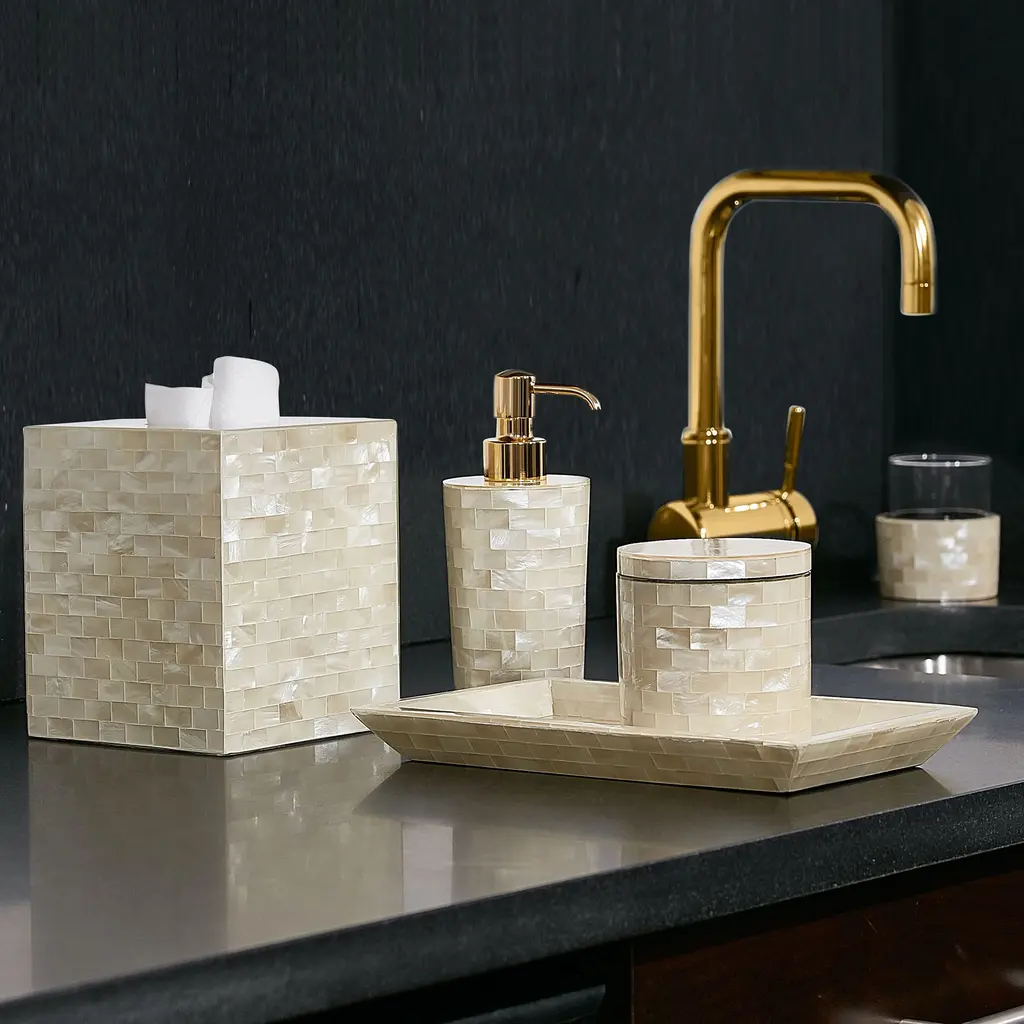Rich pearl hammershell creates a stunning collection of bath accessories. Each piece reveals hints of pink and gold, for a sparkling touch to your bathroom decor.