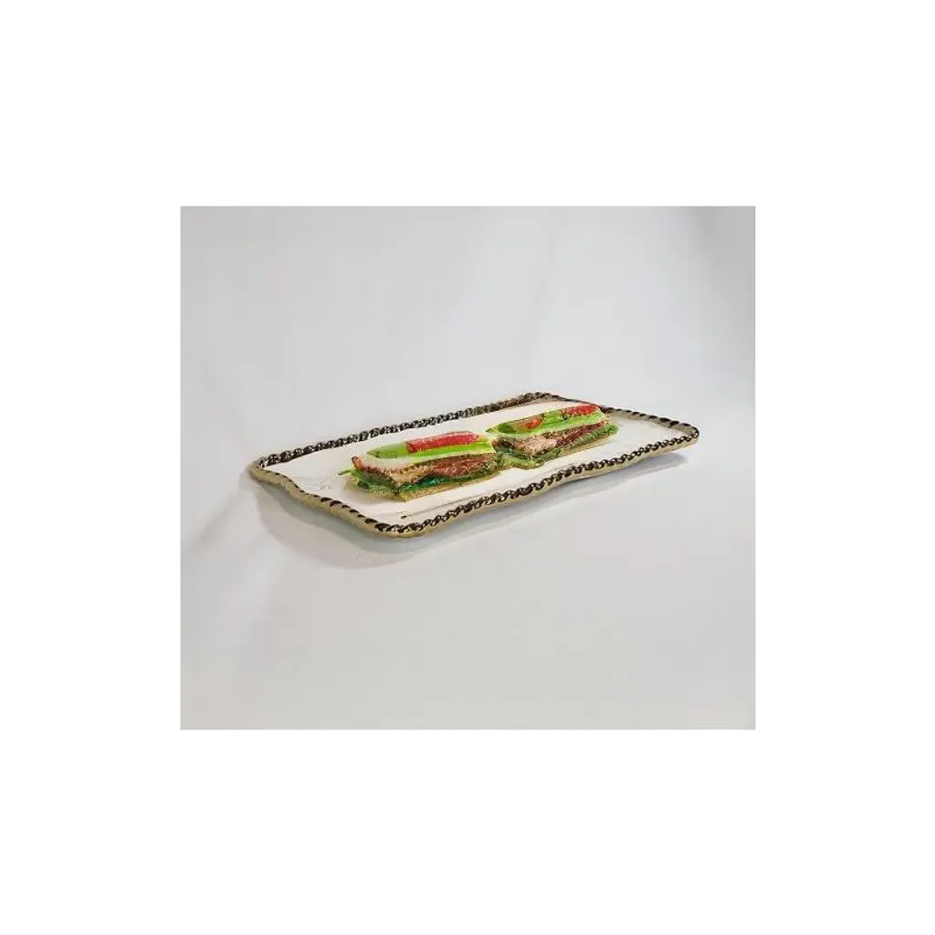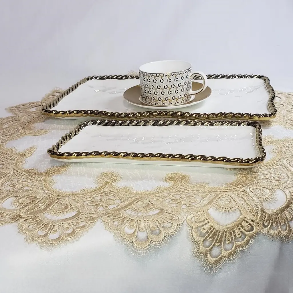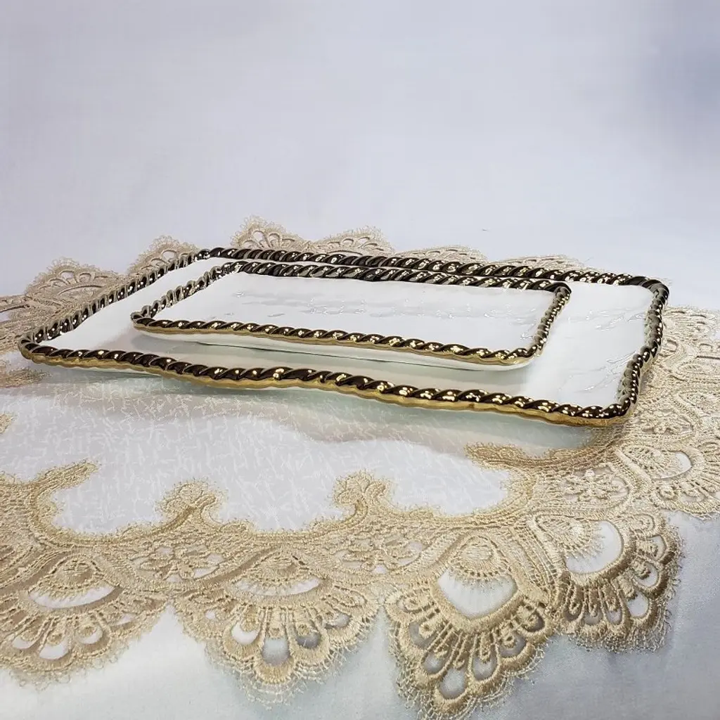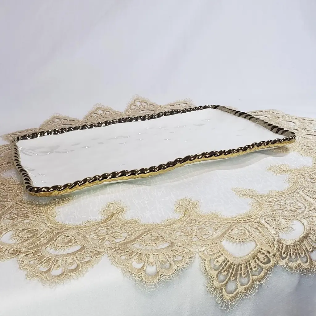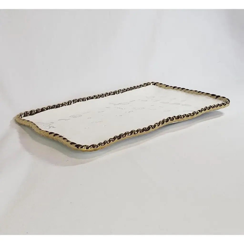 White Ceramic Serving Tray With Gold Accent Rope Rim