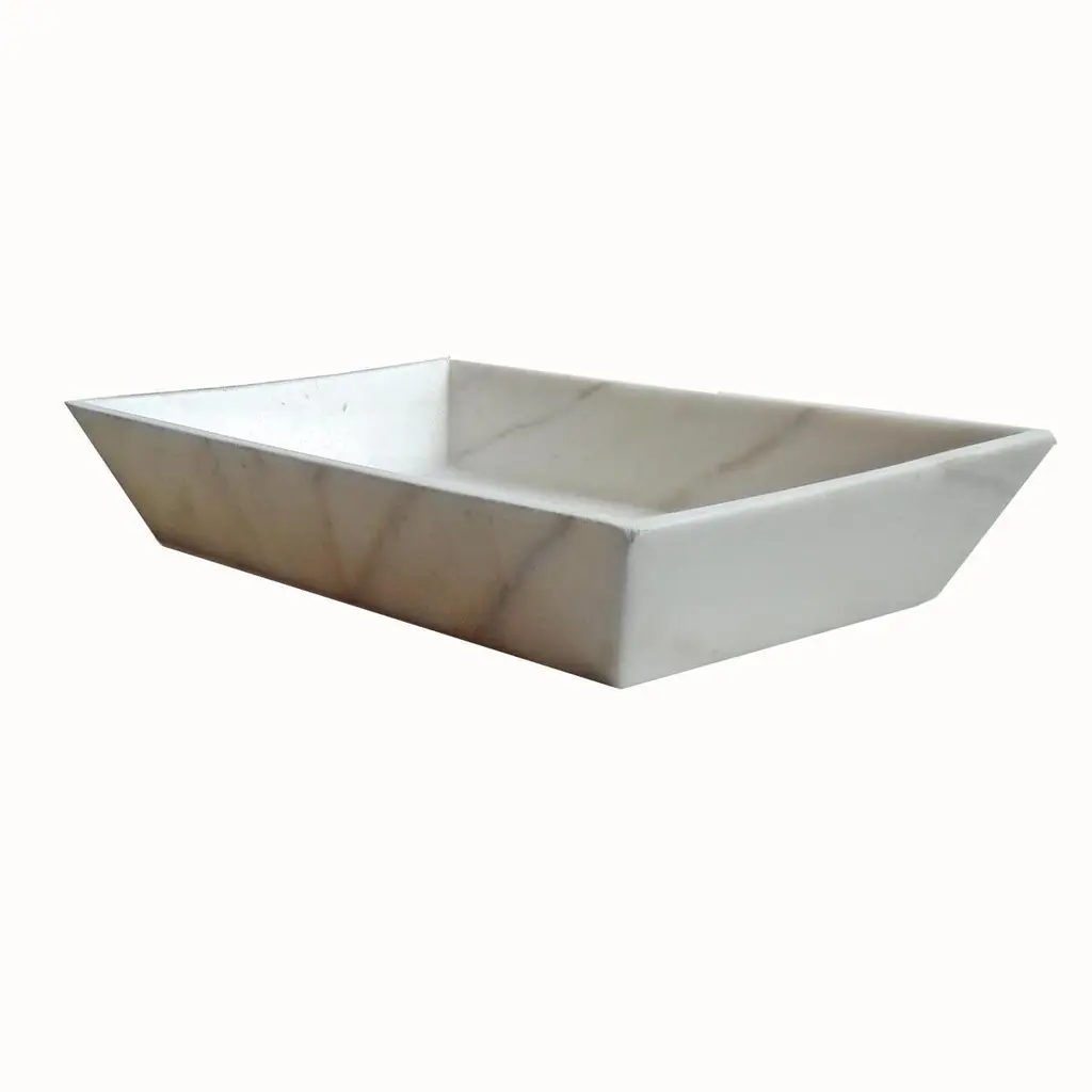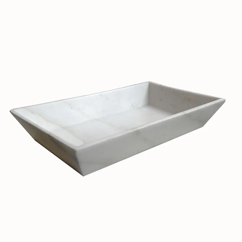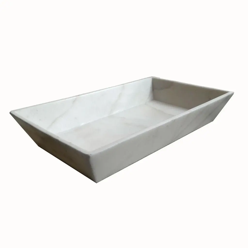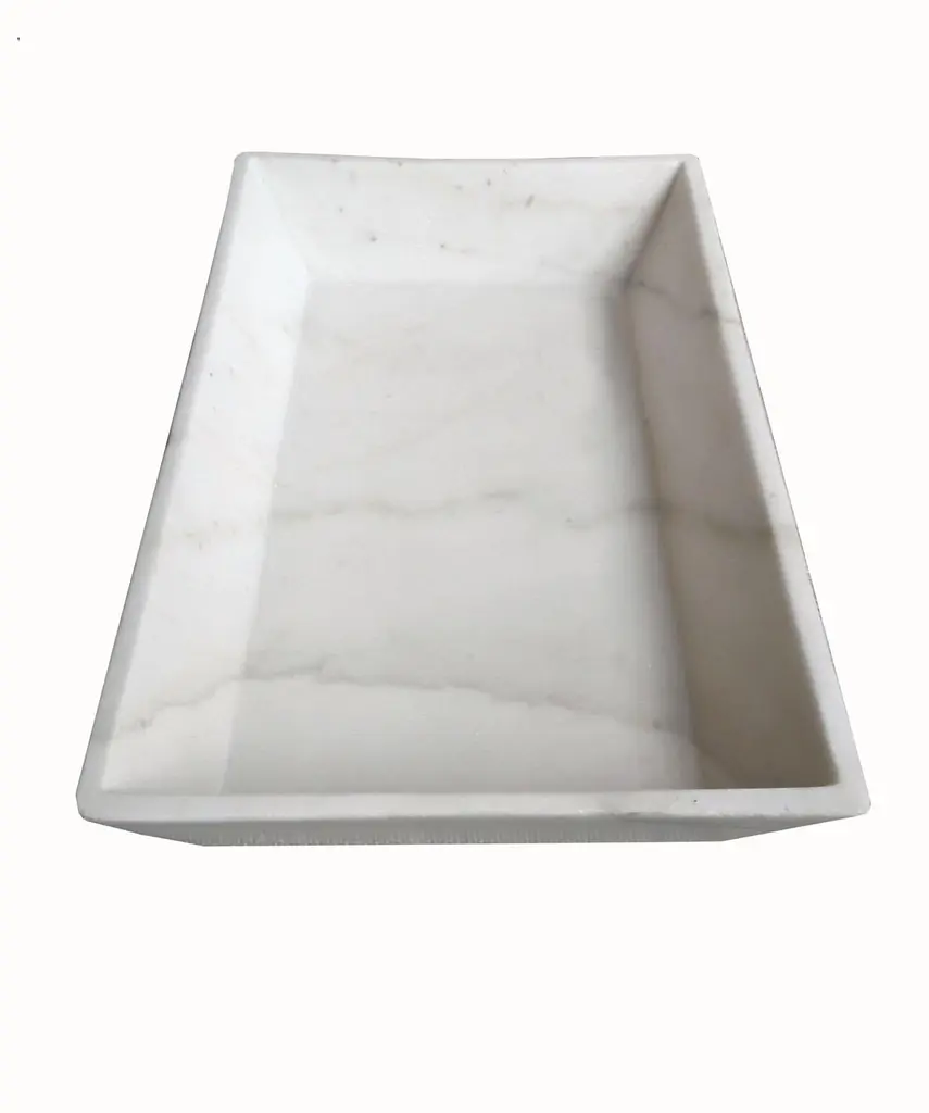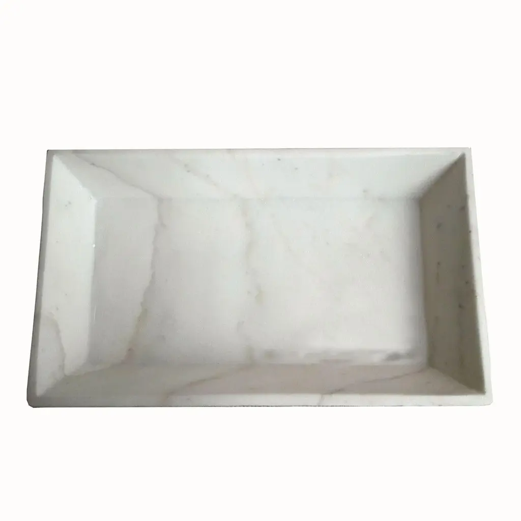A white marble tray from India with beveled sides. Sleek and elegant, this small tray is ideal as an accessories tray for a bedroom vanity, a bathroom hand towel tray, or as a decorative element in any other room.