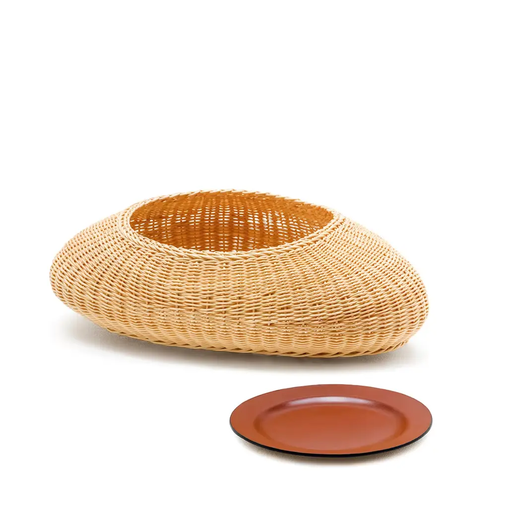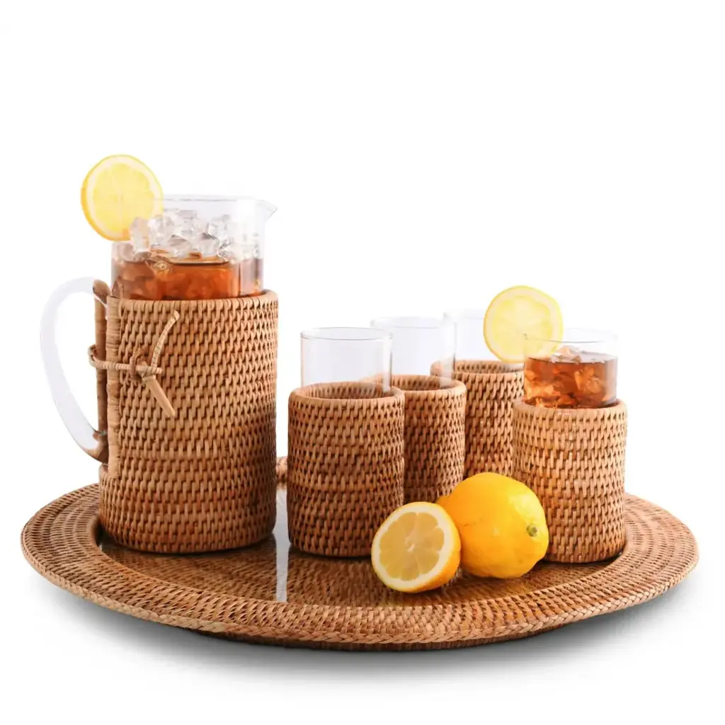 Meet our Premium Handwoven Rattan Serving Tray, an impeccable blend of practicality and artistry. Crafted from high-quality hand-woven rattan material, this unique serving tray adds a touch of natural elegance to any setting. Its generous 18-inch diameter format is perfect for serving drinks, appetizers, or meals while ensuring ease of transport thanks to sturdy handles. Ideal for those entertaining or seeking sustainable products at home. Vagabond House is a family-owned American company specializing in fine pewter tableware, servingware and giftware. Largely inspired by nature, their exclusive products are designed to be unique, functional heirlooms for those who seek to express tradition and style in both family and formal entertaining.
