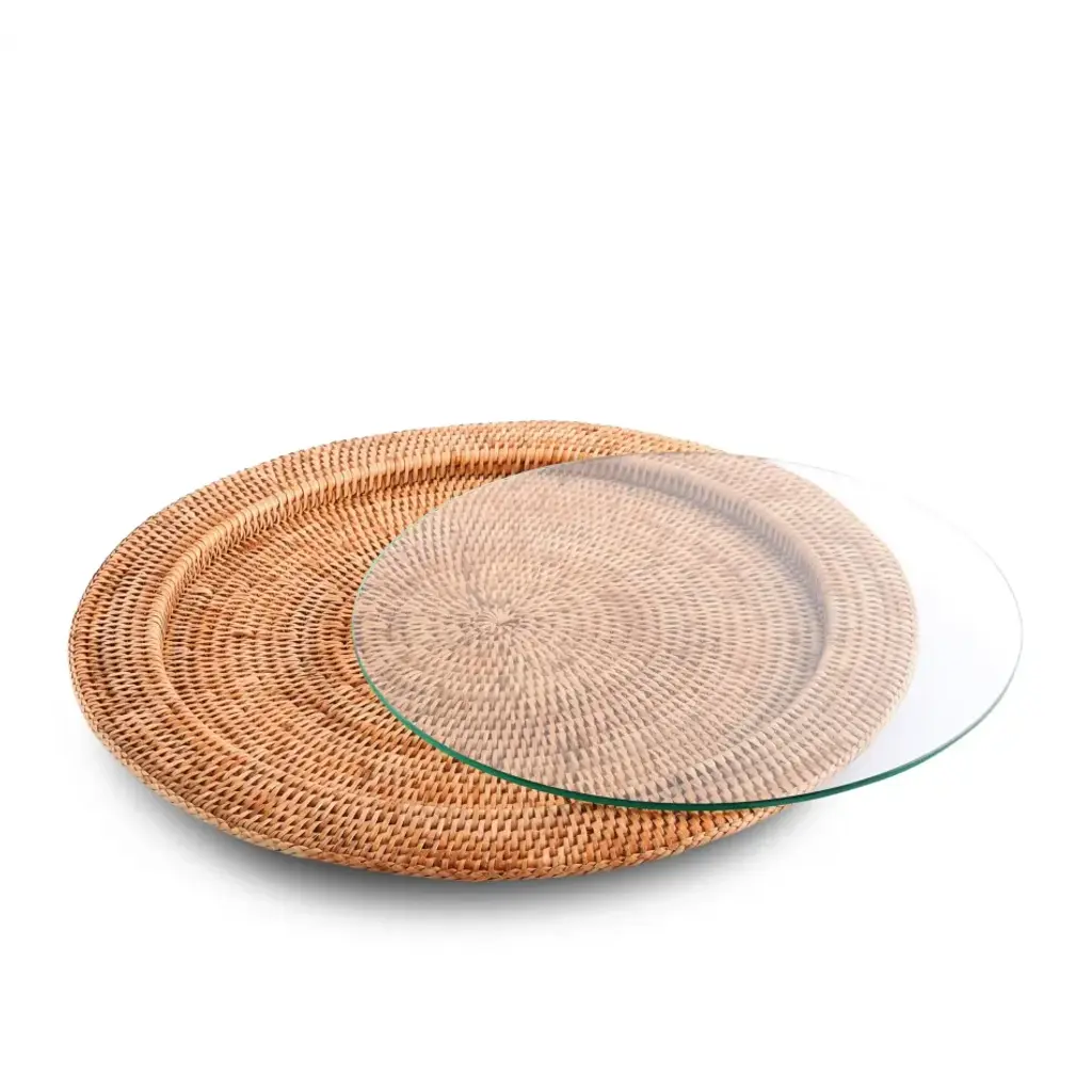 Wicker Rattan Serving Tray Round Glass Insert 19 Inch