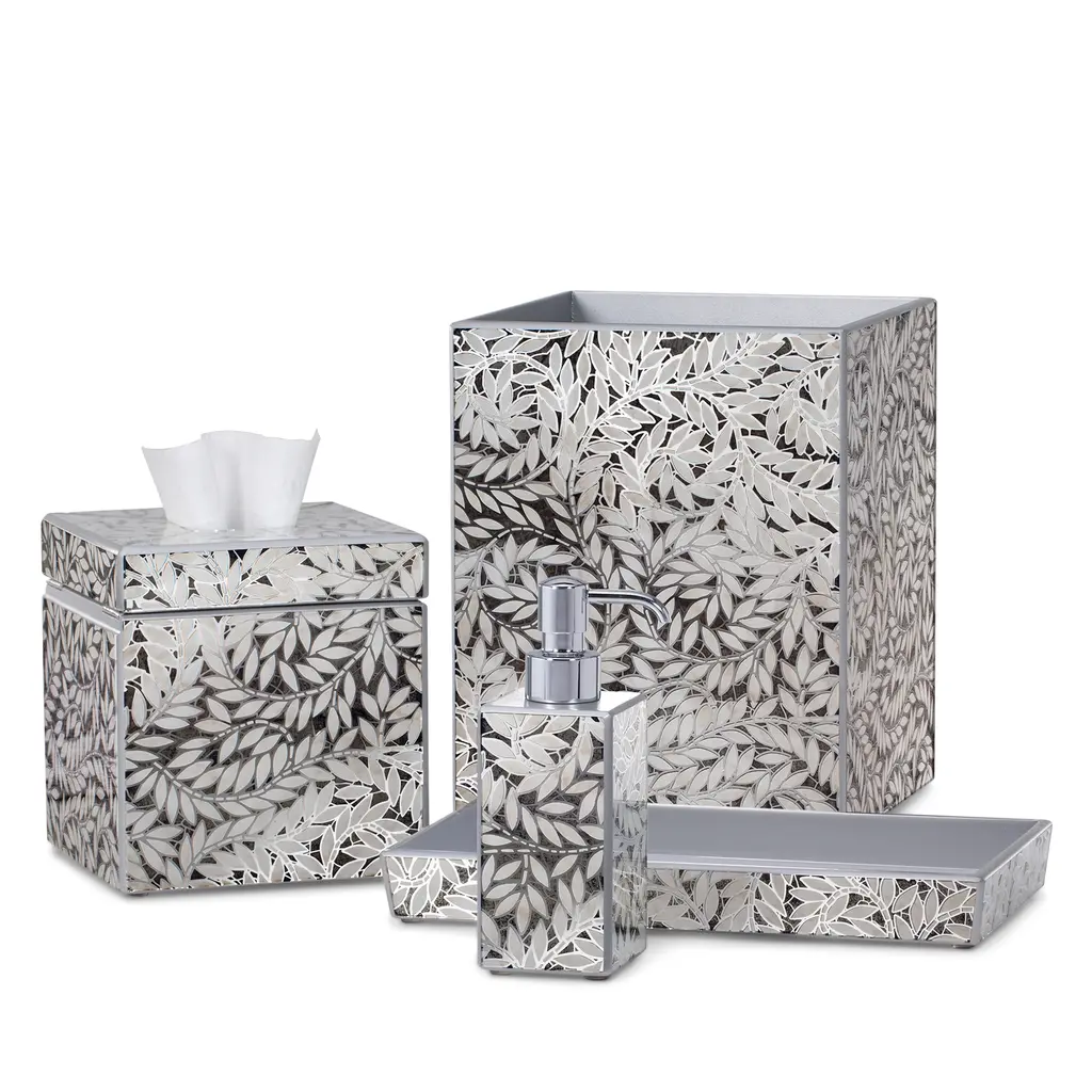 Chic contemporary art for your bathroom. The Willow Collection from Labrazel includes accessories with sparkling hand-painted mirrored panels on sturdy wood frames. The design, in soothing tones of ivory and gray, is preserved behind glass.