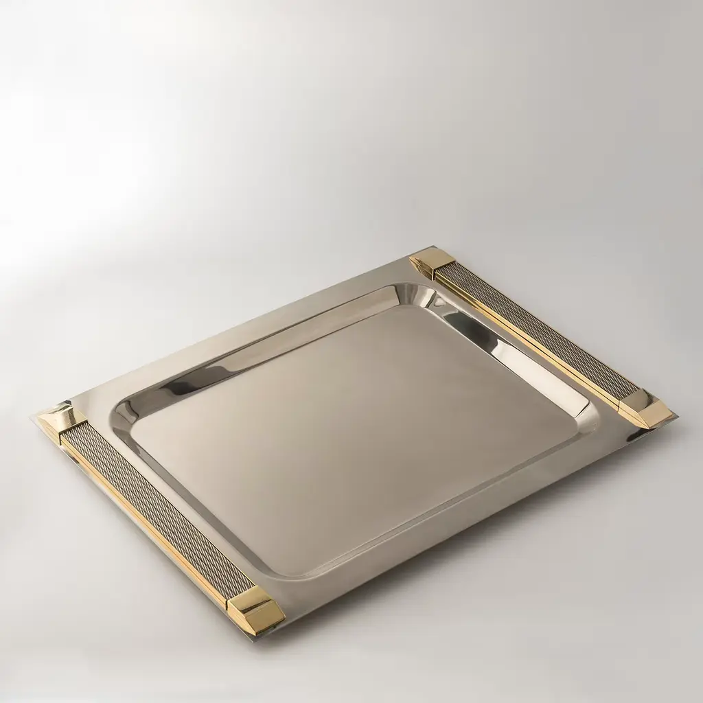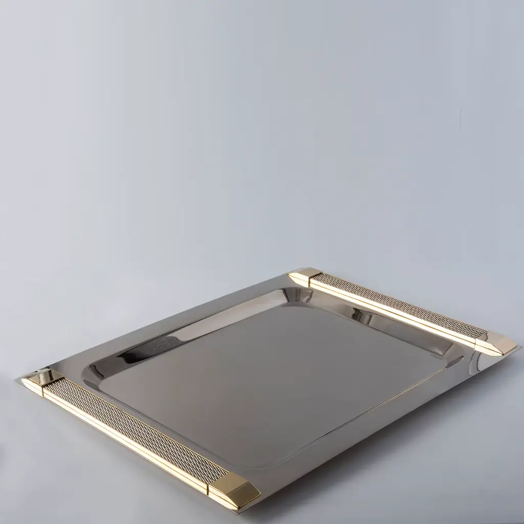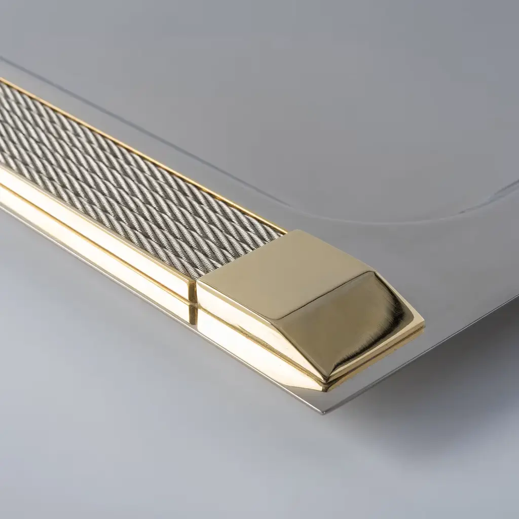 A splendidly refined objet d'art that can function as a decorative or serving tray, this splendid design by Nino Basso will make a sophisticated addition to any style decor. Inspired by the life at sea, it features two handles with a 24K gold-plated brass element containing stainless steel nautical cables for a modern and stylish flair. Entirely crafted of nickeled brass boasting a polished finish, it comes with a black box (53x42x6cm).