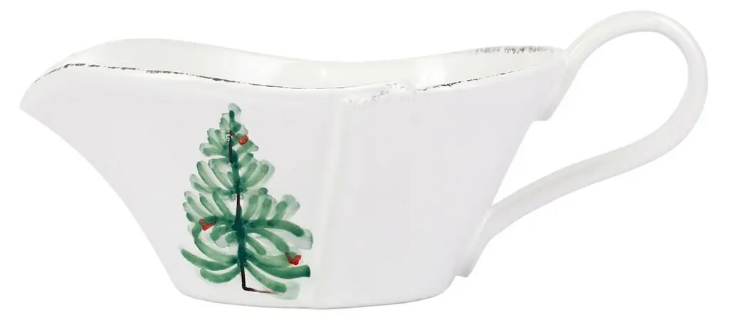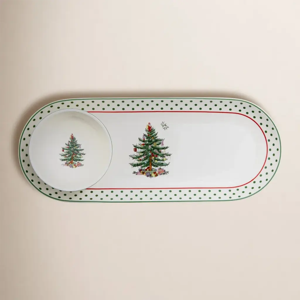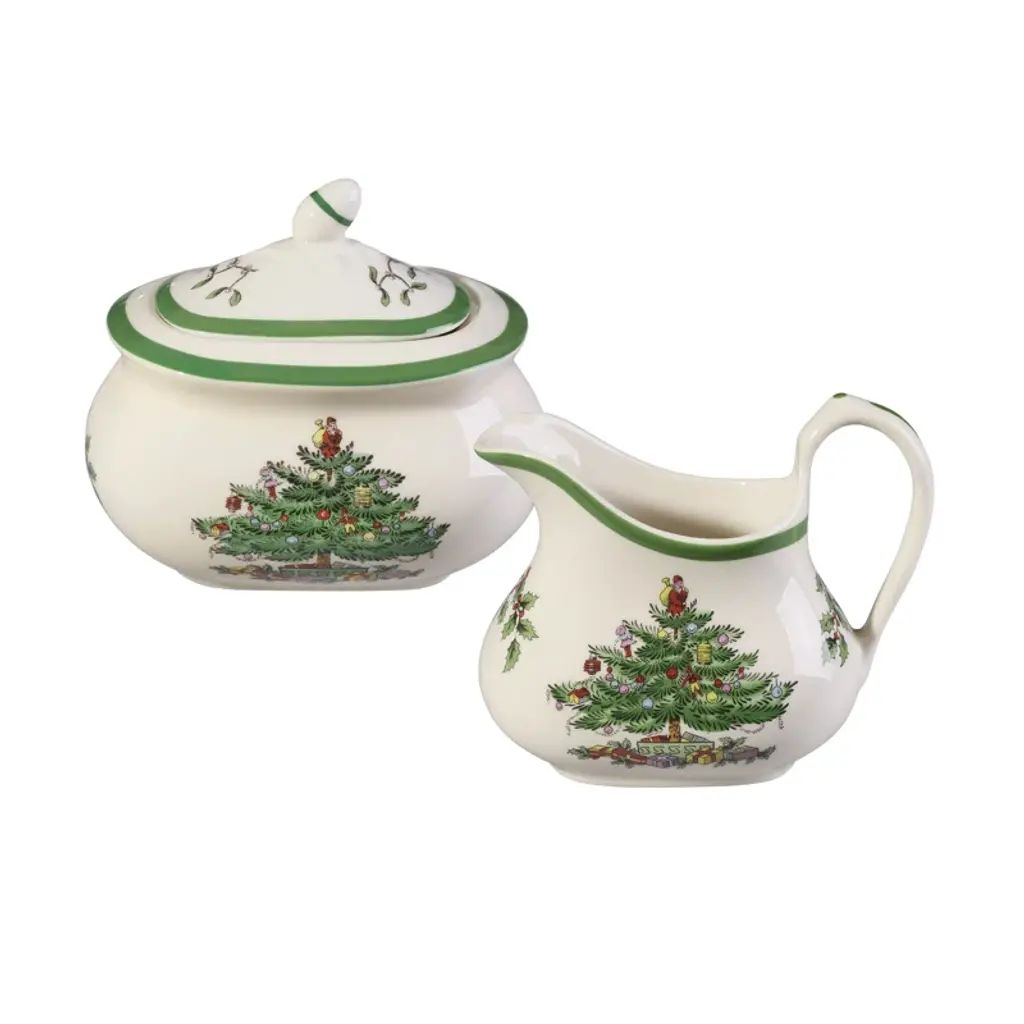 Serve in style with the wooden tray and Christmas Tree sugar and creamer set. A charming way to elevate your holiday table.