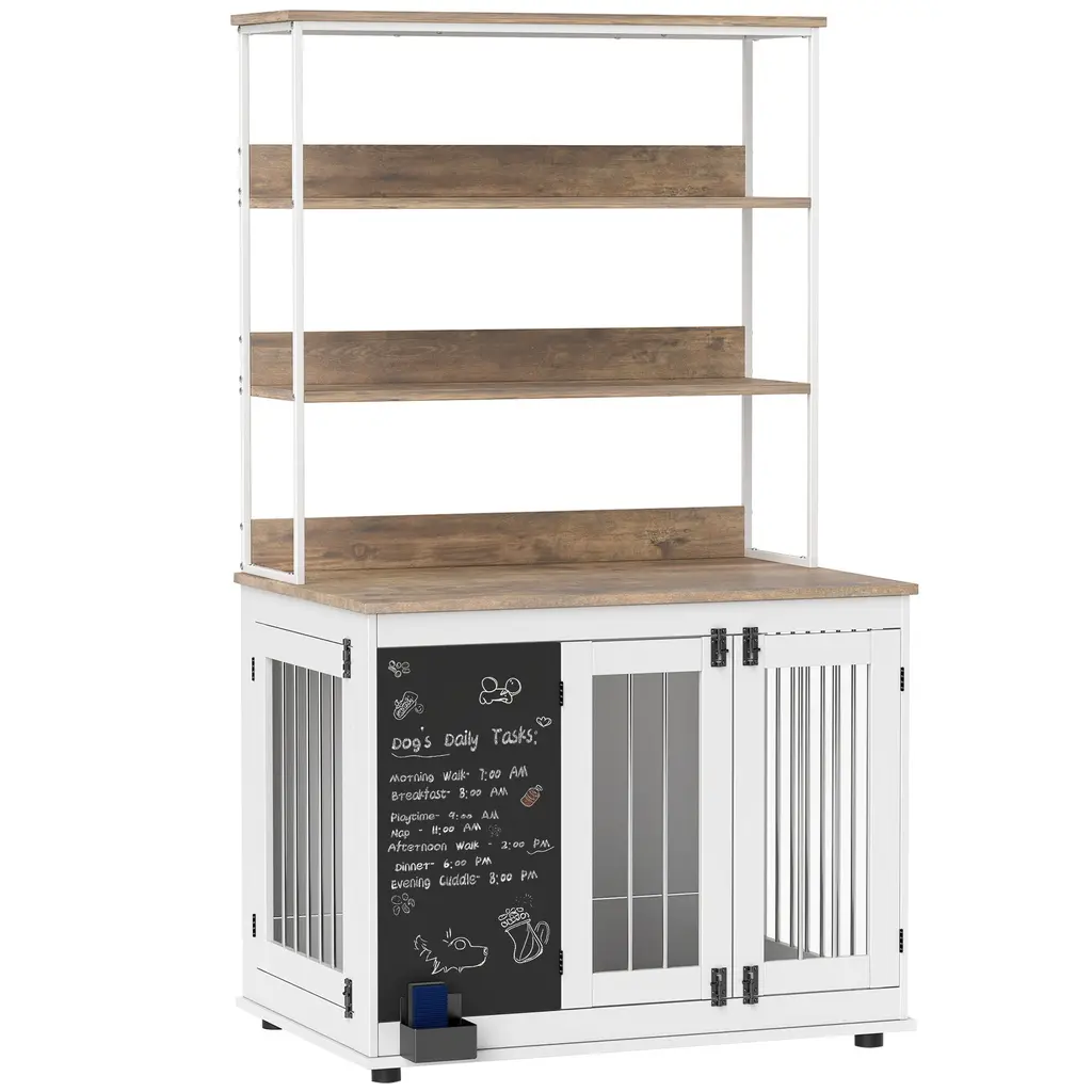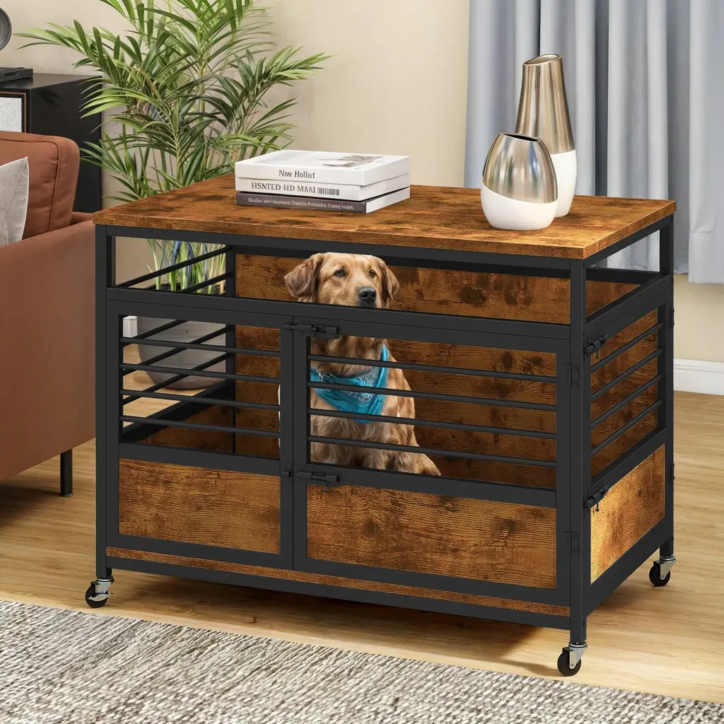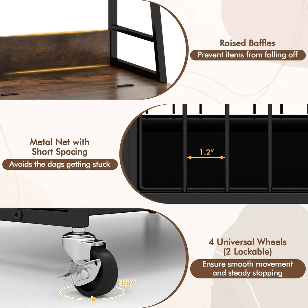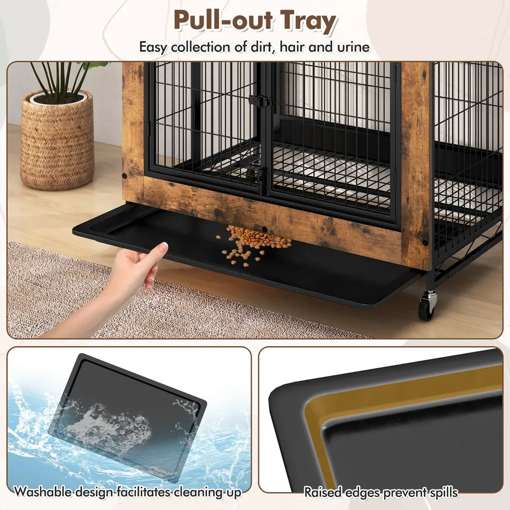 Wooden Dog Crate With Storage Shelves, Tray And Lockable Wheels - 59" X 38" X 25" (L X W X H) - Rustic Brown
