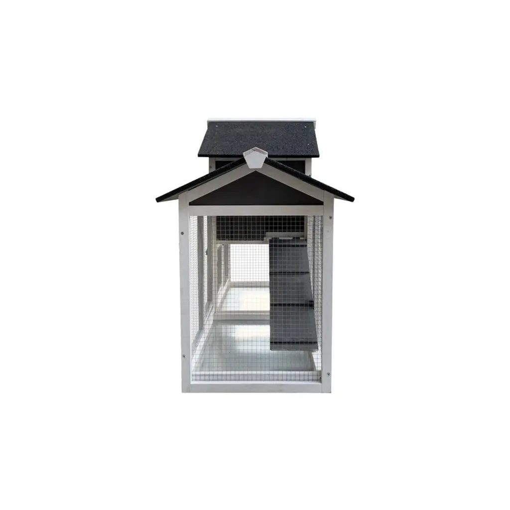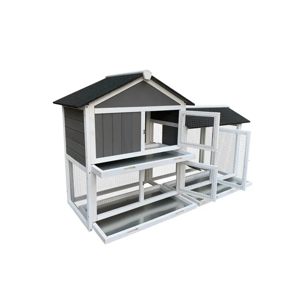 1. Crafted from high-quality fir wood and durable asphalt, this rabbit hutch is built to last. Its weather-resistant asphalt roof and upper nest box offers superior protection from harsh weather conditions. The milled fence provides a sturdy barrier to keep predators out while ensuring optimal ventilation. 2. Featuring a multi-level design, this luxury guest cabin is perfect for indoor and outdoor use. It provides ample room for rabbits, chicks, guinea pigs, Cole ducks, hedgehogs, and other small animals to play and exercise., 3. With a ramp connecting the resting and activity areas, your cute furry friends can enjoy a comfortable and private sleep. The lower level is perfect for playing, while the upper mini terrace, surrounded by a wooden fence, is designed for observation. 3. This rabbit cage features three lockable doors and three pull-out trays, including a removable bottom sliding tray for quicProduct Description Description: This rabbit cage is a luxury cabin designed for small animals, including rabbits, chicks, guinea pigs, ducks, hedgehogs and other small animals, providing them with enough space to play and move around. The rabbit cage is built with high-quality pine wood and waterproof asphalt for strong durability and weatherproofing. It also includes a multi-level design that includes an activity area and a resting area, as well as a staircase that connects the two areas, allowing your pet to easily access the resting area. In addition, the rabbit hutch is very easy to clean, featuring a removable tray and multiple lockable doors that allow you to easily access and interact with your pet. Product details Size: 56.7''L x 20.9''W x 37.2''HWeight: 50 lbs Material: high-quality pine wood and waterproof asphalt Maximum load capacity: suitable for 1-3 rabbits Design: multi-level design with stairs connecting the resting and activity areas Features: weatherproof, easy to clean, multiple lockable doors Suitable for: rabbits, chicks, guinea pigs, ducks, hedgehogs and other small animalsProduct Features· Sturdy and Weatherproof· Spacious Space· Thoughtful Separation Area· Easy to Clean and UseDimensionsAssembled Length (in.): 61.80Assembled Width (in.):20.86Assembled Height (in.):36.22Weight (lbs.):42.80Notice:Manual measurement has been used, there may be some reasonable error.Due to factors such as display equipment and shooting environment, the color of the item may be slightly different from the picture, which is a normal phenomenon, please refer to the actual item.Please confirm whether the size meets your requirements before you buy it!Contact US:After-sales Email Address: dhalcomb@doorise.comIf the item comes with any defect, damage(include damaged in transit) or missing partsand, please contact us with detailed images for free replacement or refund.