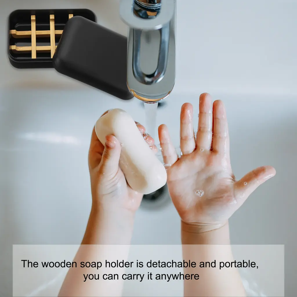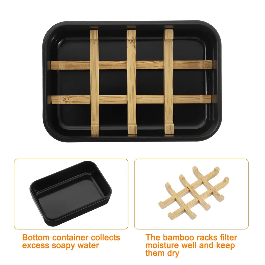 Description:1. Material: The wooden soap holder is made of bamboo fiber, and its built-in stand is made of bamboo,fine workmanship, lightweight, fashionable and simple.2. Design: This wooden soap holder consists of bamboo fiber body and bamboo frame. The built-in bamboo rack of the soap box supports the soap, which can filter water well, prevent the soap from getting damp and sticky, and keep it dry; and it is detachable and portable, providing us with a lot of convenience.3. Easy To Use: Just place the soap on the wooden soap holder. If you want to clean it, just use your fingers to remove the tray or turn the bath soap tray over.4. Wide Application: The wooden soap holder is suitable for soaps with a thickness within 3.5cm. It is good for homes, hotels and offices. You can place it in bathrooms, kitchens, laundry rooms, bar sinks, etc.; you can also give it as a gift to your friends.Specification:Color: BlackMaterial: Bamboo Fiber, BambooOverall Size: 8.5 x 12.5 x 5cm / 3.35 x 4.92 x 1.97 inch (W*L*H)Package Content: 1pcs x Wooden Soap Holder
