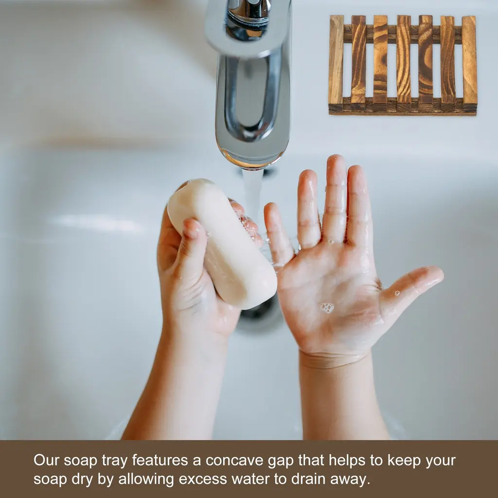Good Material: Our soap tray is made from natural wood, the wood grain is beautiful, polished smooth, strong, and durable. The wood not only adds a touch of warmth and elegance to your bathroom decor but also provides excellent durability and resistance to moisture.Concave Design: Our soap tray features a concave gap that helps to keep your soap dry by allowing excess water to drain away. This design prevents soap from becoming damp and extends its lifespan, ensuring that holds your soap stably.Easy to Clean: Maintaining our soap tray is effortless. Widened hollow strips, smooth water leakage, simply rinse it with water and wipe it clean with a cloth or sponge. The smooth surface of the wood allows for easy removal of soap residue, making it clean and convenient to use.Scope of Application: Our soap tray can be used in various settings, such as bathrooms, kitchens, or even by the sink. It is not only suitable for holding soap but also works well as a good gift for family, and friends. Its versatile nature makes it a practical and stylish addition to any space.Specification:Material: Bamboo WoodSize: 11.5 x 8 x 2.2 cm / 4.53'' x 3.15'' x 0.87'' (L x W x H)Package Content: 1 x Soap Dish