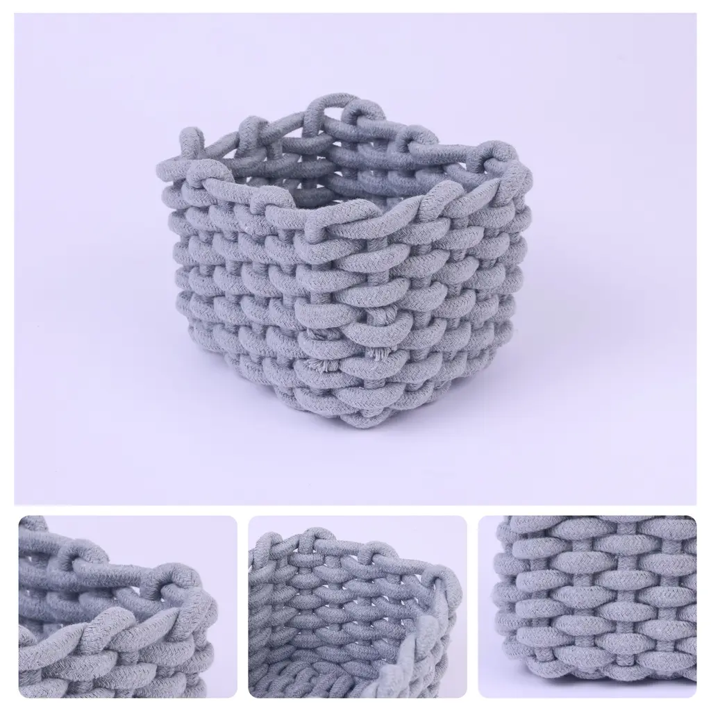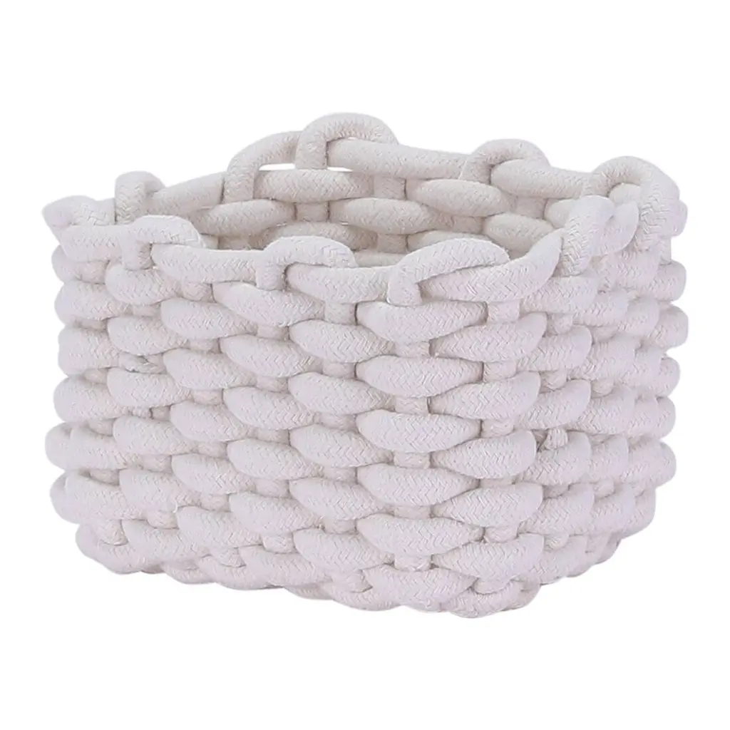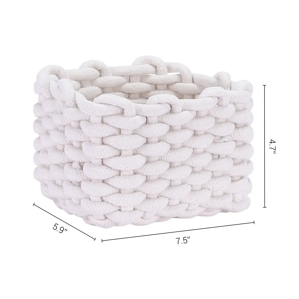 Premium Material: Our small storage basket is meticulously handcrafted from odorless cotton rope. They are designed with no sharp corners. The chic appearance make these baskets a fashionable and functional addition to any decorEasy Shaping: Upon receiving your rope basket, please remove it from the packaging and fill it with items such as clothes or dolls to help it regain its shape. For quicker shaping, consider using a steam ironCompact Size: Our rectangular closet small woven basket for organizing intimate clothing, books, towels, cosmetics, snacks, and other small items, and key bowl for entryway tableGreat Gift: This basket storage perfect size to fit everything and very aesthetic. Worked perfectly for making a get-well basket for a friend. Our woven storage basket is a ideal gift for Easter, Christmas, Thanksgiving, Mother's Day, Father's Day, Valentine's Day, or girl's birthdayMultiple Use: This organization basket is great for putting blankets, shoes, clothes, towels, decorative pillows, hats, scarves, magazines, headset wire, remote control, magnetic card, keys, note storage, vegetables, fruits, CD, flowers and more home supplies by the front door. Fits on a bedside table, closet shelf, bookshelf, desk, floor, etcOur basket for bathroom, and designed with jute string and portable handles on the base. Minimalistic combined with a rustic style makes the whole flower basket simple and elegant. Handles design, easy to move and take away, free awesome practical adorable jute storage bin for daily use.These cotton rope baskets are designed to fit perfectly on shelves, closets, and even under beds, making them an ideal solution for organizing your home or office.