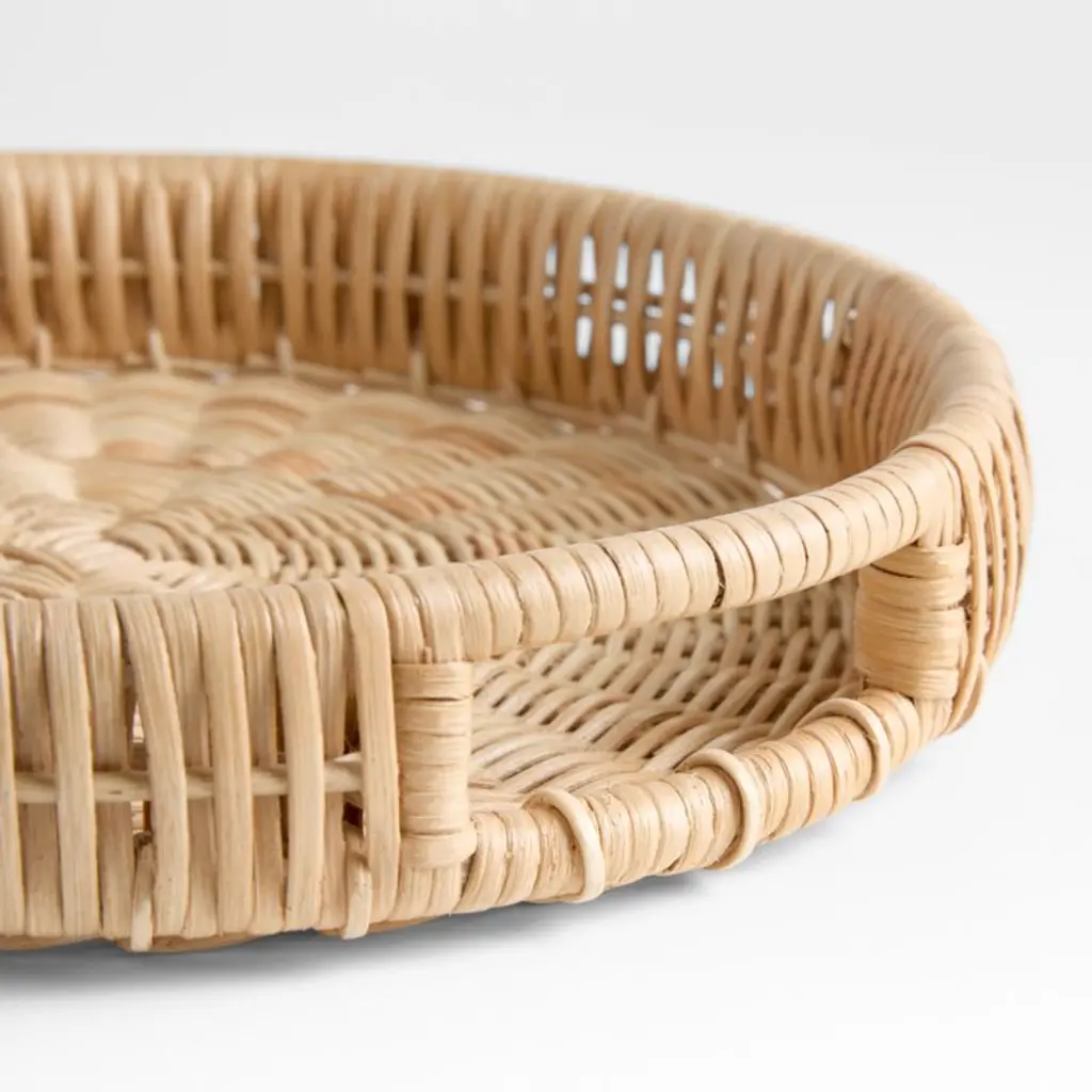 Serve appetizers, fresh fruit or tropical cocktails in breezy coastal style on our round tray. Handwoven by talented artisans, the tray incorporates cutout handles that preserve the tray's circular shape while making it easy to pass apps or tote drinks from the kitchen to the patio. Natural rattan gives the wicker tray a coastal look we love, whether holding glassware on a bar cart, candles on a coffee table or hors d'oeuvres on an alfresco bar.