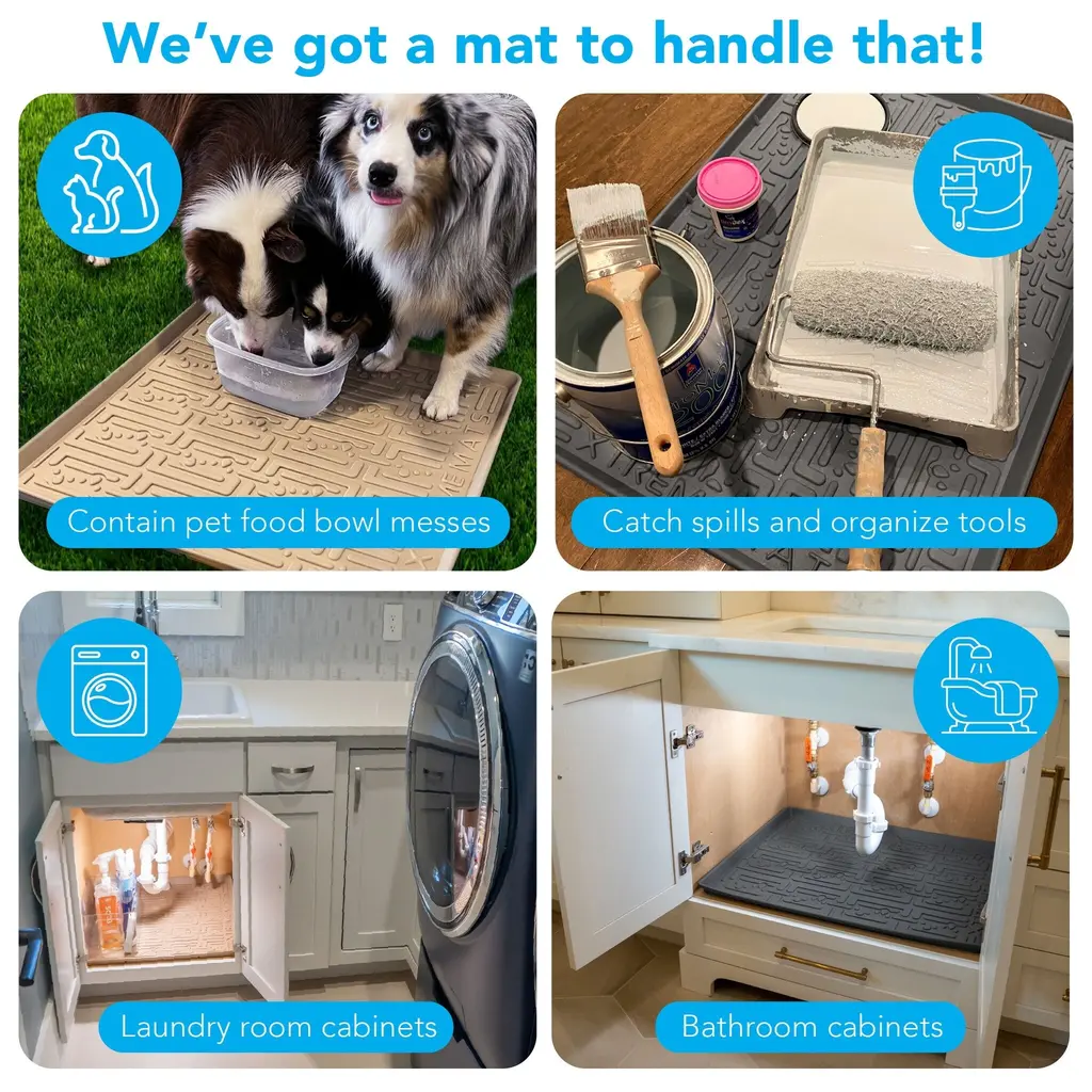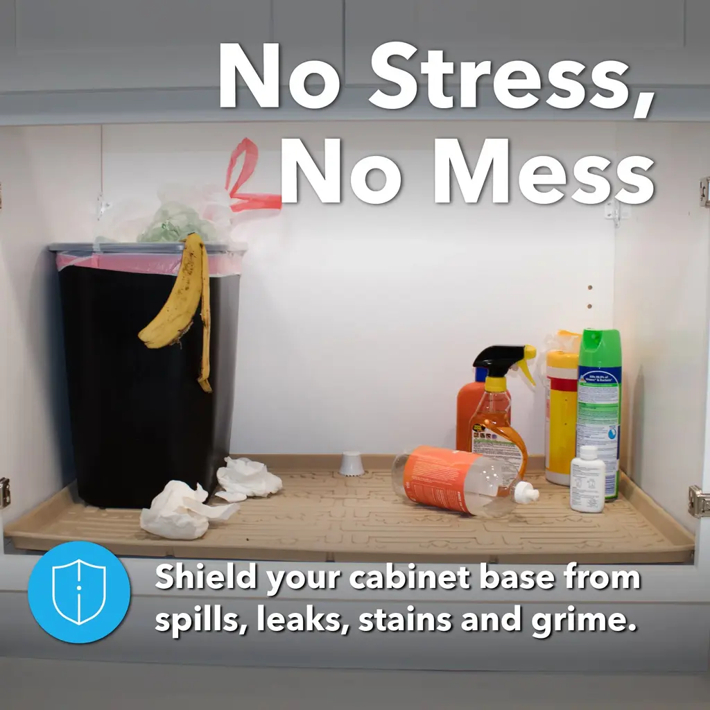 Introducing the Xtreme Mats Under Sink Cabinet Mat, a revolutionary solution designed to protect your kitchen and bathroom cabinets from damage caused by water leaks, spills, and household cleaner leaks. Our mat is not just a protective layer; it's a versatile tool to enhance the organization and longevity of your cabinet interiors. Perfect for homes, offices, and commercial spaces, rental properties, vacation properties, the Xtreme Mats bring peace of mind with a blend of functionality and style. Also serves as a utility tray, boot tray, and multi-purpose mat for containing life's messes. Key Features Superior Protection: Engineered with a waterproof design, our mat safeguards your cabinets against damage from leaks and spills, ensuring your investment stays pristine over time. Advanced Material: Crafted from a flexible, eco-friendly material, the mat contours to your cabinet's base, providing an optimal fit. Its durability stands up against cracks, curls, or warps. Innovative Design: Features a unique raised-edge design, capable of holding up to 1.3 to 3.6 gallons of liquid, depending on the size. This ensures spills are contained within the mat, not on your cabinet floor. Easy Installation & Maintenance: No tools required for installation. Simply place the mat into the base of your cabinet for immediate use. For maintenance, a quick wipe or rinse is all it takes to keep the mat looking new. Eco-Friendly & Safe: Made with materials free from BPA, phthalates, and other harmful chemicals, making it safe for use in homes with children and pets. Versatile Use: Ideal for under kitchen sinks, bathrooms, or any area with potential for water damage or chemical spills. Its sleek design complements any decor. Dimensions & Compatibility: Available in various sizes to fit most standard under sink cabinets. Please measure your cabinet's interior dimensions for the perfect fit. Product Specifications Material: High-quality, eco-friendly polymer (No VOCs) Color: Available in beige or grey to match your interior Sizes: Multiple sizes to ensure a perfect fit for any standard cabinet Capacity: Holds 1.3 to 3.6 gallons of liquid (depending on size) Warranty: Comes with a manufacturer's lifetime limited warranty - please refer to packaging for details Care and Maintenance For light cleaning, wipe the mat with a damp cloth. For heavier spills, remove the mat and rinse under water. Allow to dry thoroughly before replacing. Disclaimers While the Xtreme Mats provide significant protection against leaks and spills, we recommend regular checks for leaks to prevent potential damage. Ensure the mat is the correct size for your cabinet to avoid gaps where spills could leak through. FAQs Q: Can the mat be cut to fit? A: For optimal performance and protection, we do not recommend cutting the mat. Please choose the correct size for your cabinet. However, the mat can be modified to accomodate existing plumbing. Why Choose Xtreme Mats? Choosing Xtreme Mats means investing in the longevity and cleanliness of your cabinet spaces. With its innovative design, superior protection, and easy maintenance, it's an essential accessory for any home. Protect your cabinets from unforeseen leaks and spills, and enjoy the peace of mind that comes with knowing you've made a smart, durable investment with Xtreme Mats. The Xtreme Mats Under Sink Cabinet Mat is a must-have for any kitchen or bathroom, offering unparalleled waterproofing and leak protection. This eco-friendly and durable under sink liner fits perfectly, safeguarding against spills and damage from household chemicals. Its non-toxic material makes it safe for homes, while the easy-clean design ensures maintenance is a breeze. Ideal for spill containment and as an under sink organizer, it's the ultimate cabinet floor protector, blending functionality with peace of mind. Upgrade your under-sink space today with Xtreme Mats and experience the ultimate in cabinet protection and organization.