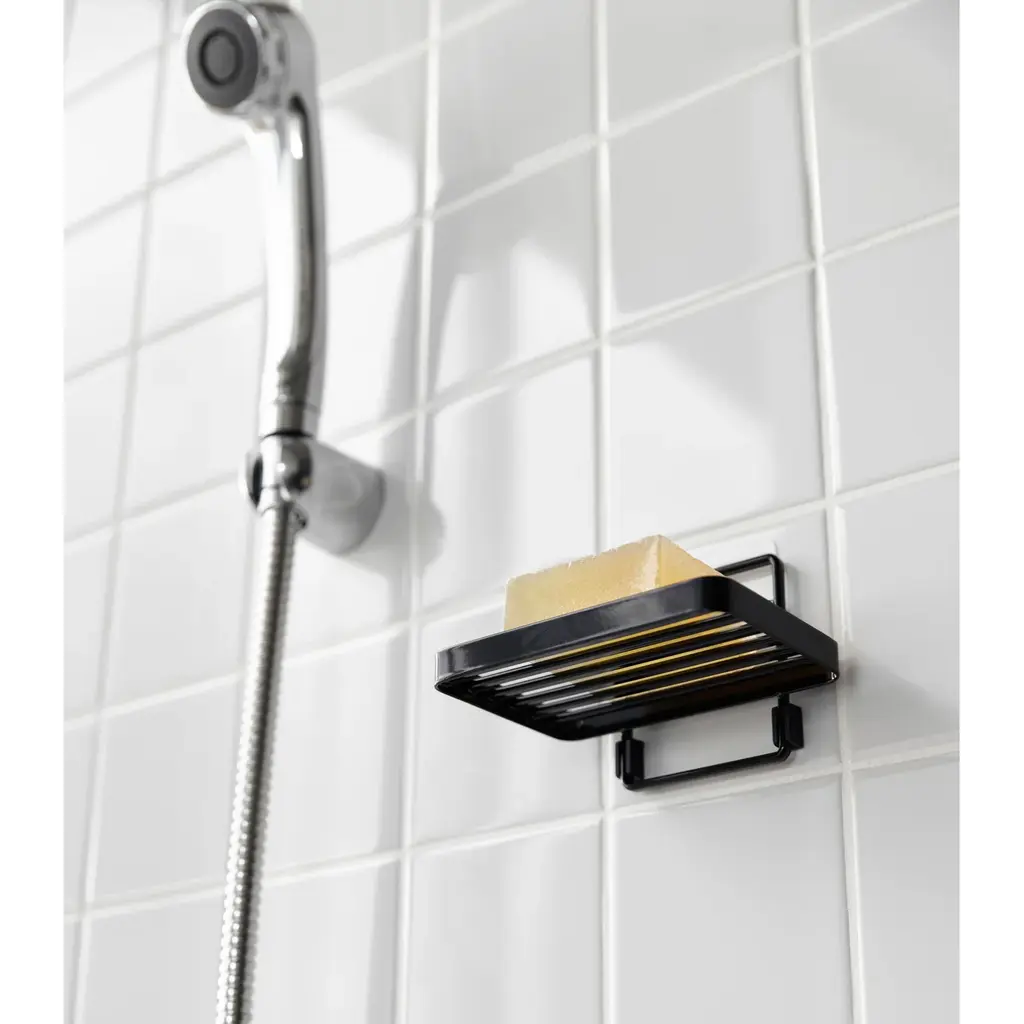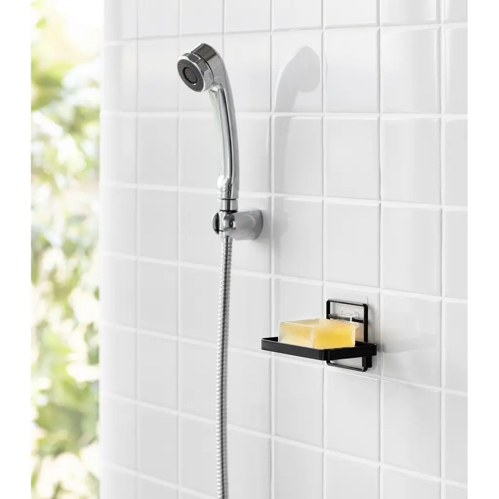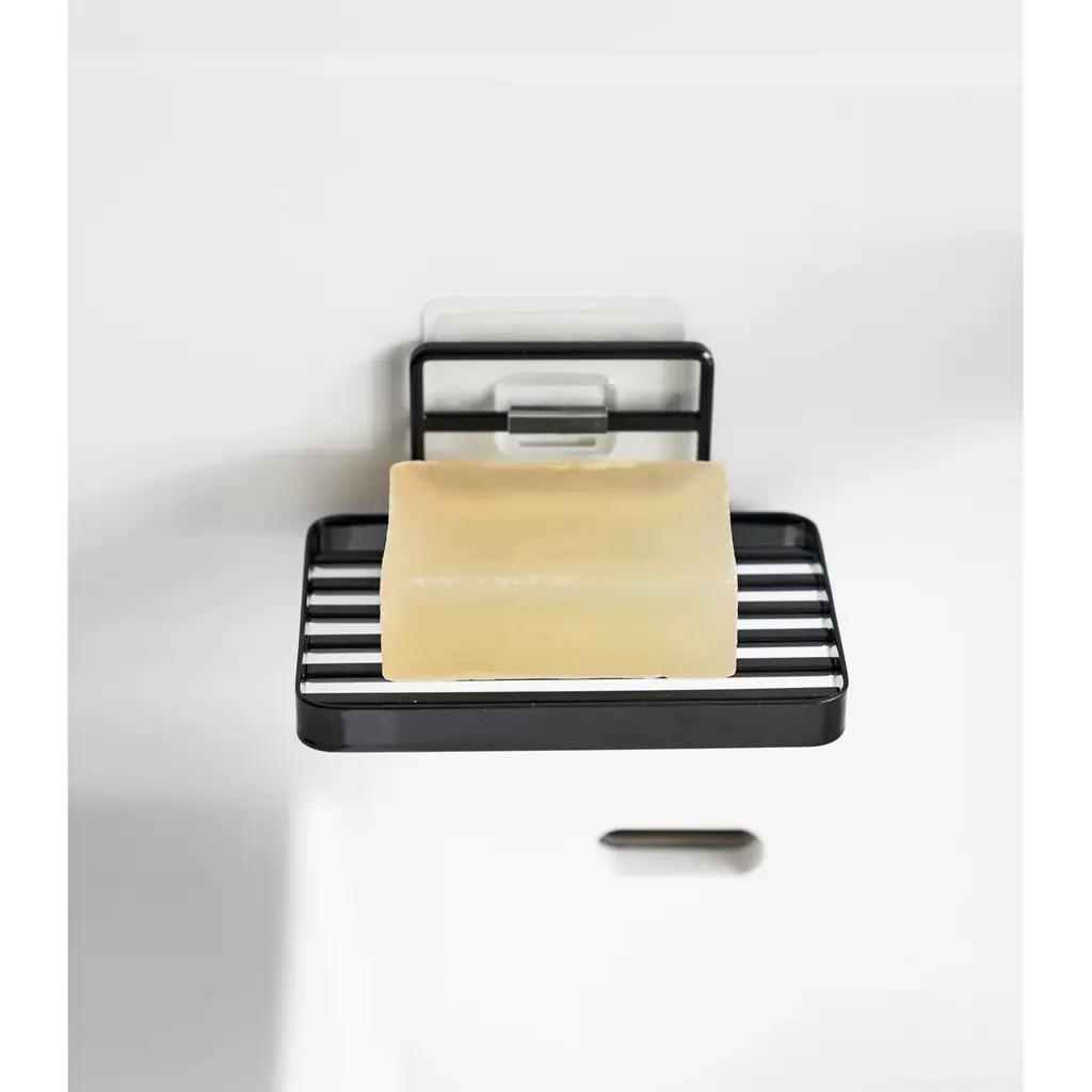 Yamazaki Home Traceless Adhesive Soap Tray, Steel, Holds 1.1 Lbs - L 3.35 X W 4.72 X H 3.07 Inches - Black