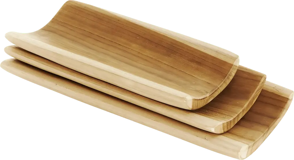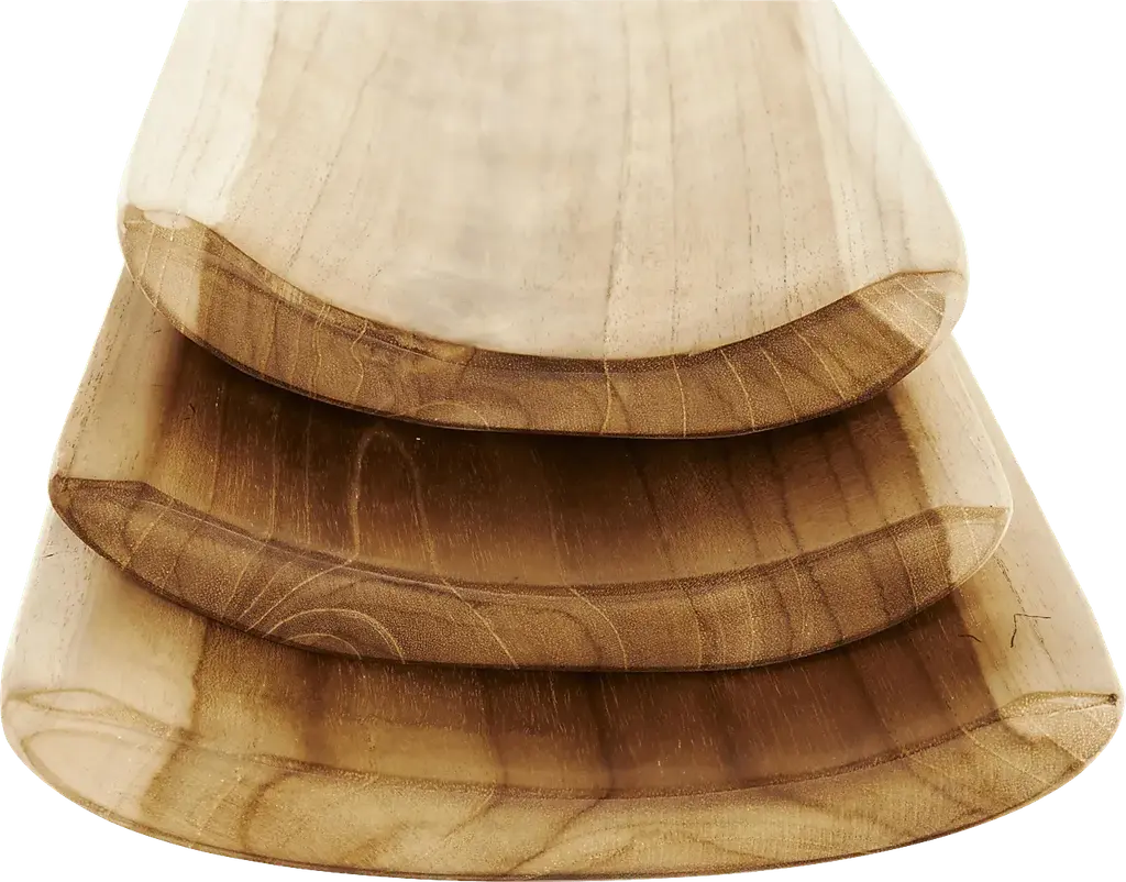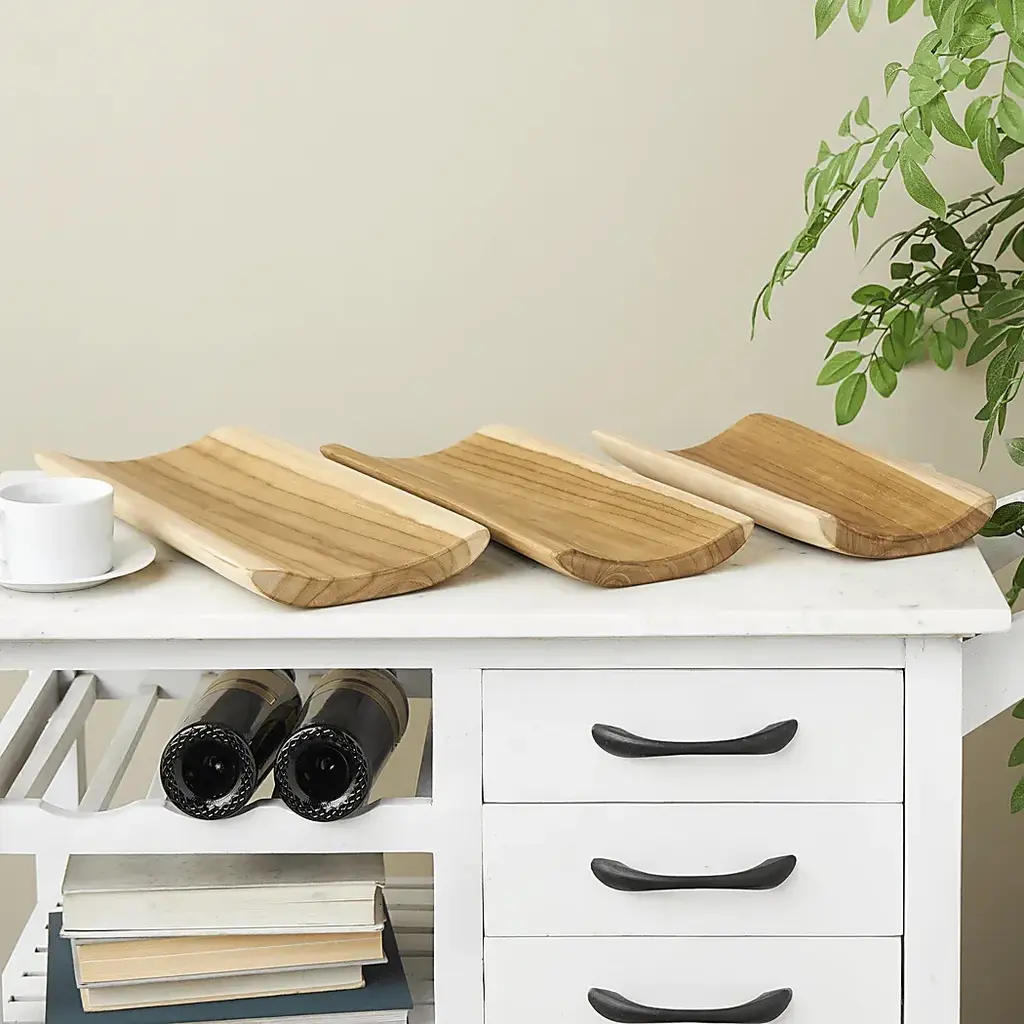 Infuse your home with cozy charm, where organic materials and warm earthy tones create a timeless, nature inspired atmosphere with the Yaoli Tray, Set of 3 . This living room decor tray set is crafted from teak wood, renowned for its durability and rich grain. The rectangle decorative tray set features a brown varnished finish, adding a warm touch to any setting. It boasts a minimalistic design with subtly curved edges, offering a modern take on traditional serving trays. Each brown teak wood tray measures 17.55L x 7.75W x 1.7H, 15.75L x 7.05W x 1.65H, 13.85L x 6.85W x 1.8H inches, and collectively weighs 6.805 lbs. Customer assembly is required.