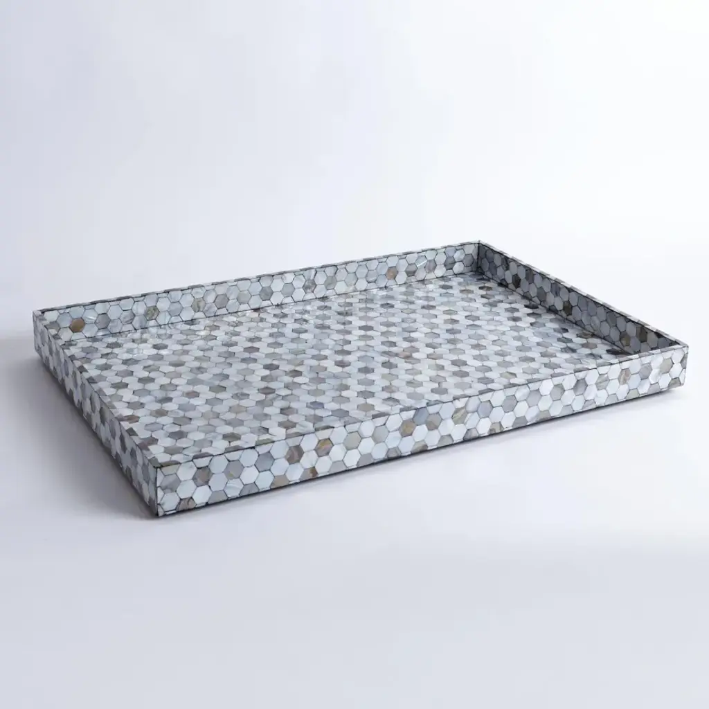 SERVE YOUR GUESTS IN SOUTHERN STYLE WITH THE YOUR SERVE TRAY FROM THE CHERYL LUCKETT COLLECTION FOR WILDWOOD. AN EXQUISITE HAND CUT AND LAID PEN SHELL VENEER CREATES A MOSAIC OF WARM CHOCOLATE TONALITY AND DISTINCT TEXTURE. NATURAL VARIATIONS IN THE PEN SHELL MAKE EACH TRAY A UNIQUE PIECE OF ART. THIS VERSATILE TRAY MAY BE USED ON AN OTTOMAN TO HOLD THE REMOTE, A BAR TO HOLD GLASSES OR A TABLETOP TO DISPLAY YOUR FAVORITE DECORATIVE ACCESSORIES.
