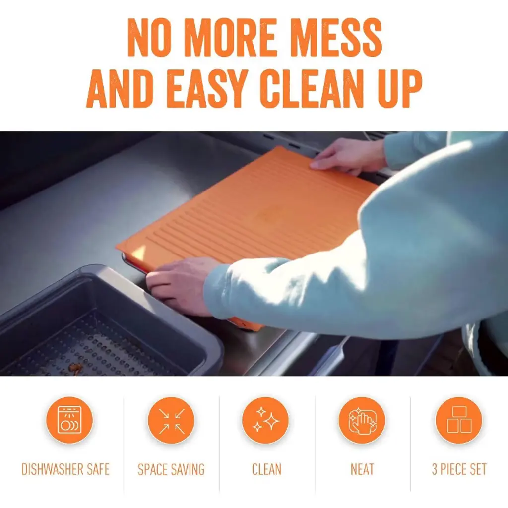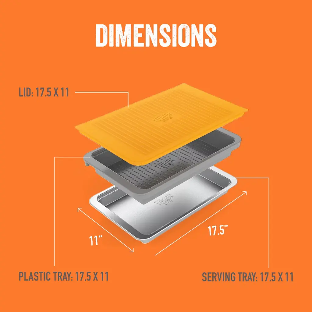 Grill pre'n serve 3 piece set , all components of this set stack perfectly into one another, so your BBQ pre tray and serving dish take up as little space as possible in your kitchen, RV, tent , or patio. The plastic grill tray component of this BBQ tray for grilling set features a unique texture that is designed to facilitate juice flow and ensure that all sides of your food soak in whatever delectable sauce you've whipped up 3 Piece set , snap-on lid that fits onto both trays, ideal for marinades or leftovers, textured plastic prep pan, stainless steel serving pan. Gorgeous stainless steel serving tray for cooked foods. No more mess and easy clean up, ( Dishwasher safe, Space saving , Clean, Neat< 3 Piece set ).