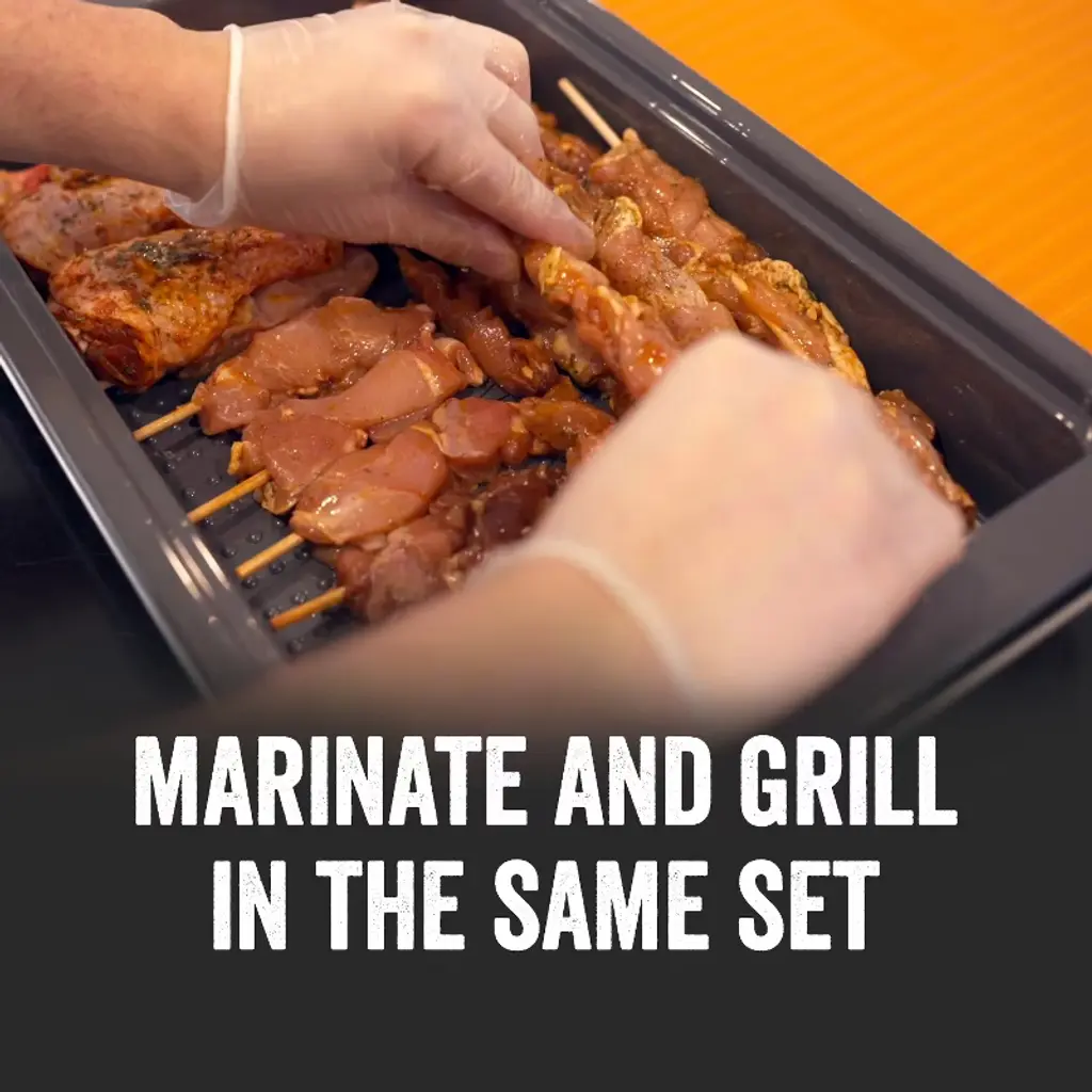 Yukon Glory Grill Prep Trays Include A Plastic Marinade Container For Marinating Meat & A Stainless Steel Serving Platter