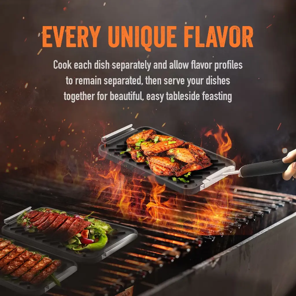 TAKE YOUR GRILLING GAME TO THE NEXT LEVEL - Are you planning on having a BBQ this weekend? With this amazing 4-piece cast iron pans BBQ set that includes 3 cast iron grill trays and 1 universal handle, cooking and serving different kinds of food at the same time is now easier than ever before.