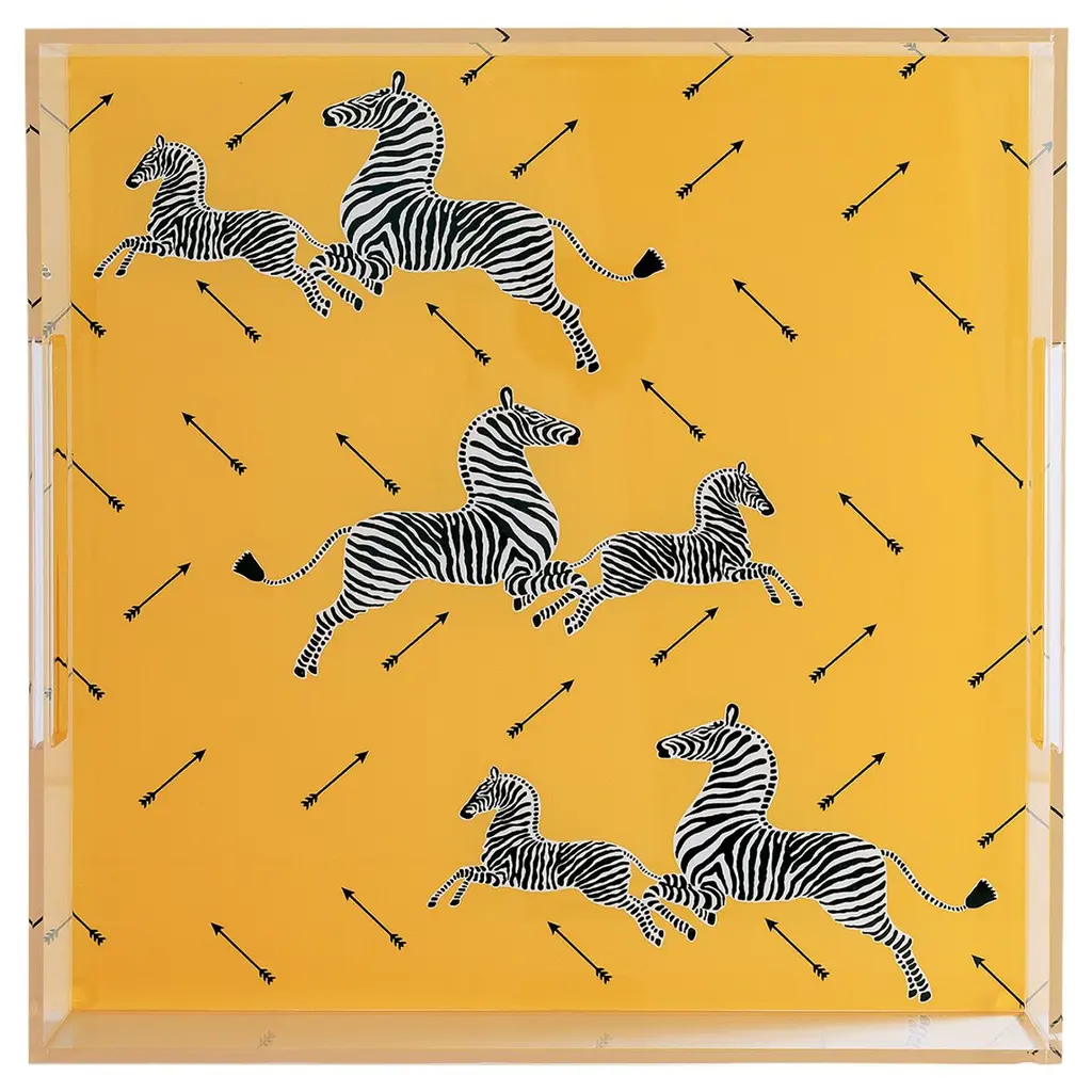 We love the whimsy of the square lucite zebra tray. The Scalamandre zebra pattern is your fun serving tray and/or gift for the adventurer in us all. Use the tray on the ottoman, in the bath or kitchen for a pop of color! A little background history: Originally designed in the 1940's for the Gino of Capri restaurant, lovingly known as "Ginos" by New Yorkers, Scalamandre restored the Zebras wallcovering in the Upper East Side institution in the 1970's after it was destroyed in a fire. Flora Scalamandre, wife of Franco, freehanded the signature motif that would come to be known as the iconic Scalamandre zebras. The pattern is celebrated the world over in design and in the movies. It was featured in the "Royal Tannebaums" and "Mighty Aphrodite".