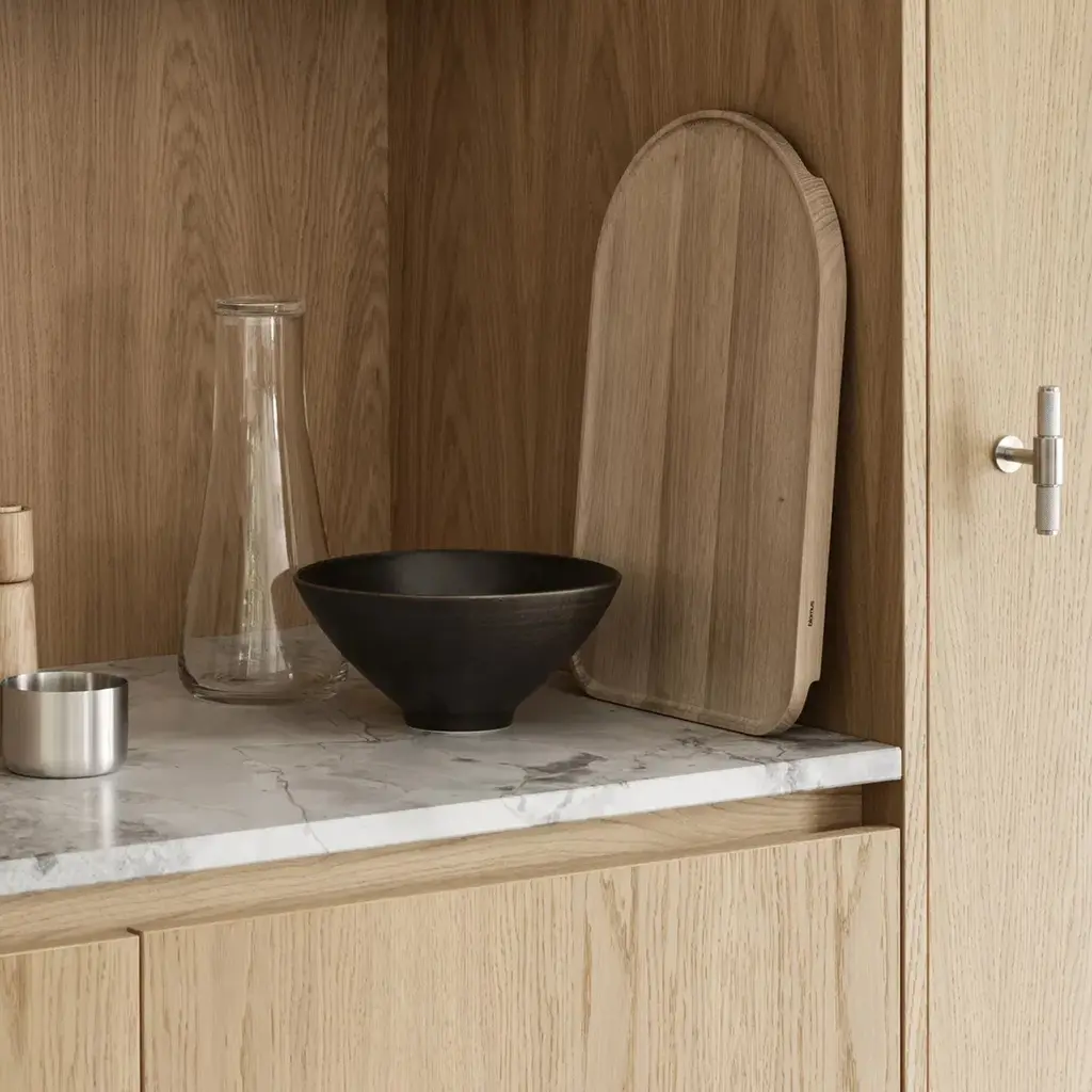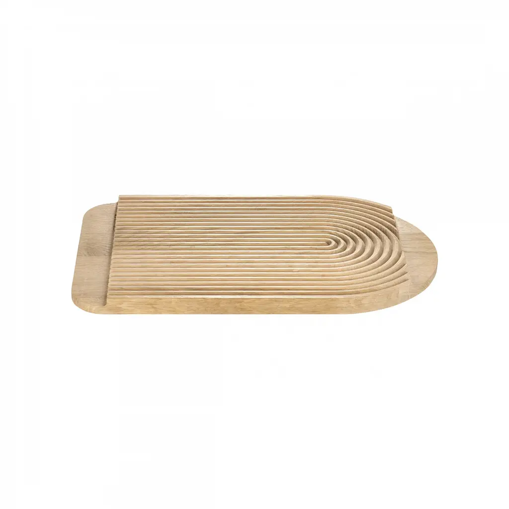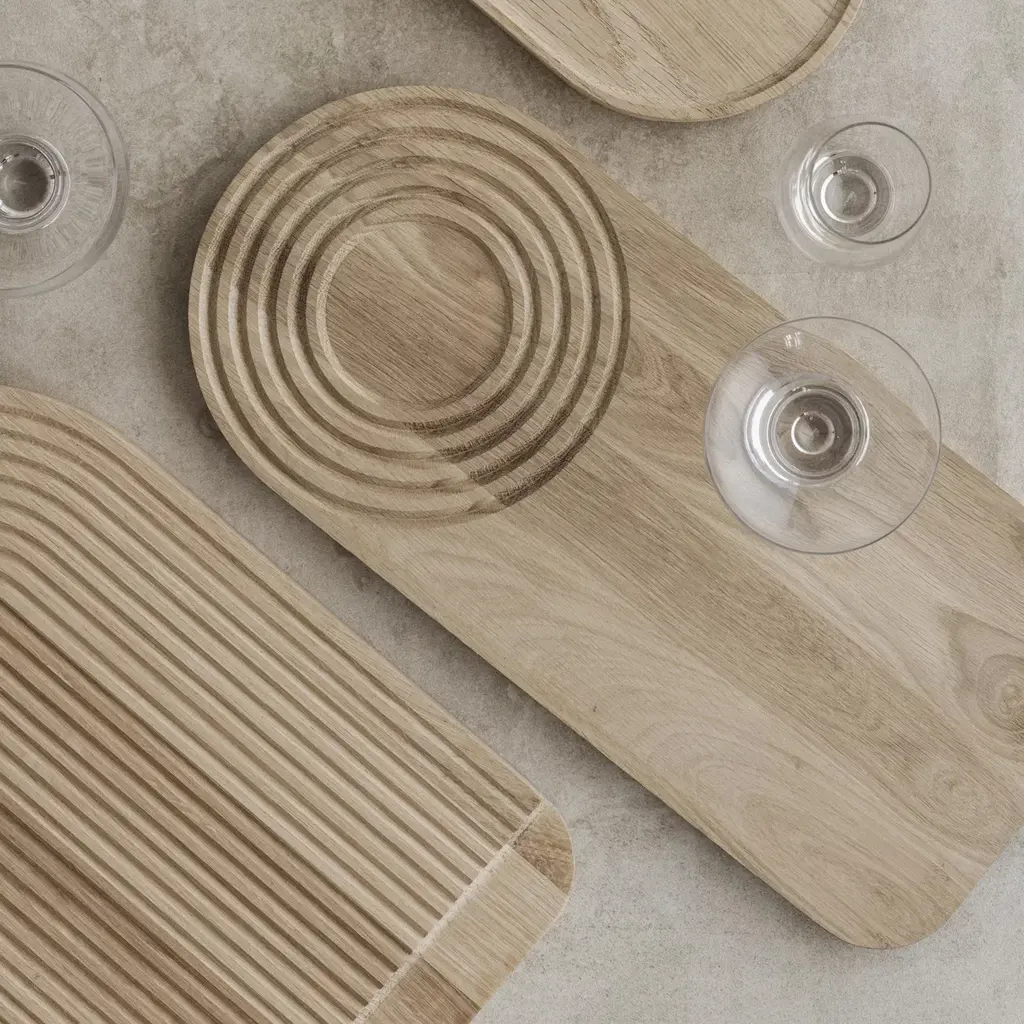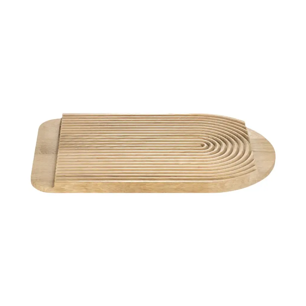 The Zen Cutting Board–Tray does double duty without shouting about it. One face has concentric grooves that catch crumbs as you slice bread or pastries; flip it over and the smooth surface with slim raised edges becomes a clean serving tray for cheese, fruit, or a morning tartine. Solid, untreated oak gives it weight and a warm grain that will develop a quiet patina with use. Designed by David Meier / Studiomeiid for blomus in Germany, its rounded geometry stacks neatly and feels good in the hand—kitchen tool by day, table piece by night.
