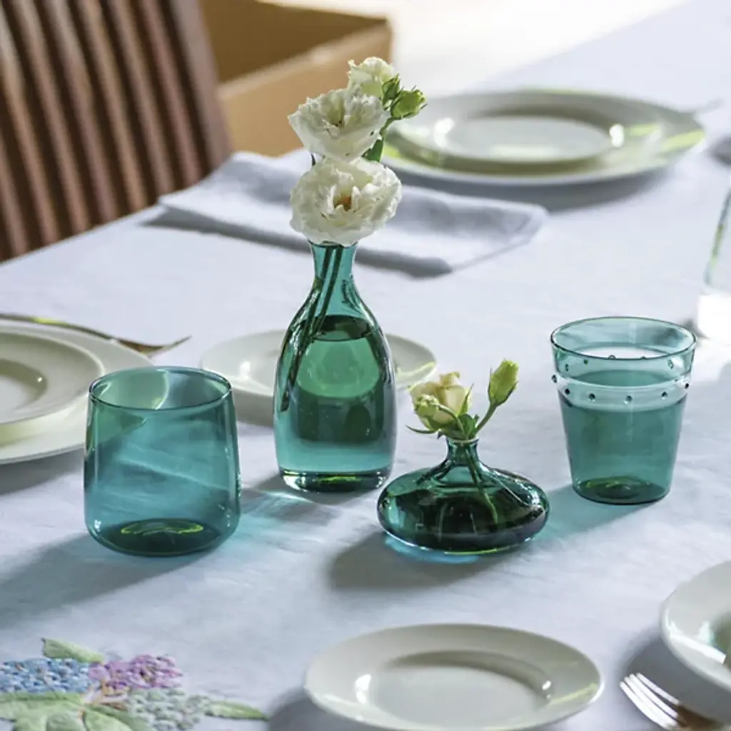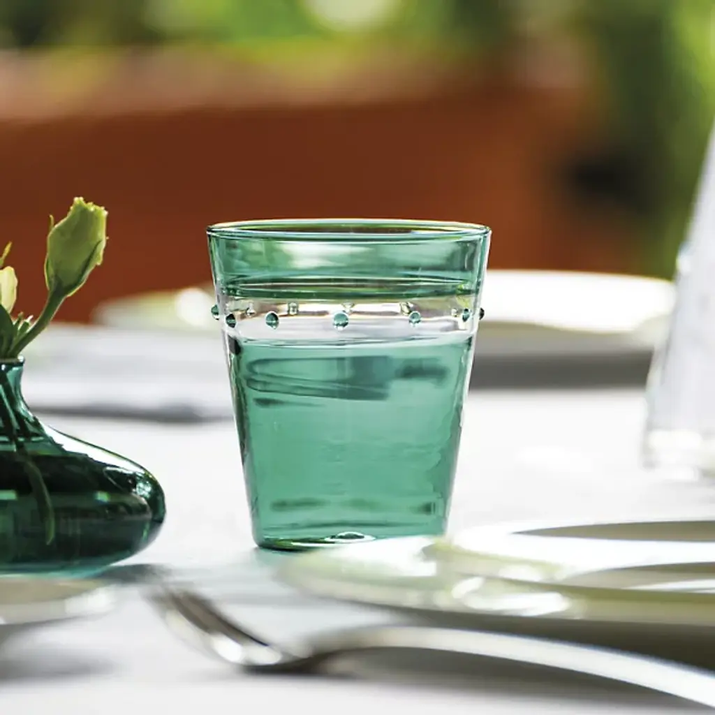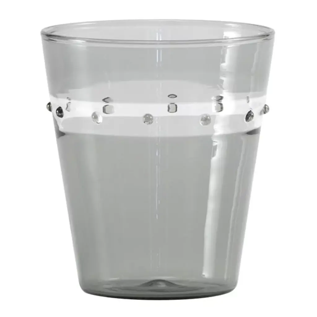The A Pallini Tumbler, Set of 4 from Zafferano America offers both art and tactile texture to group gatherings. Each tumbler is a flaring, dishwasher-safe construction with an inverted cone shape made of mouth-blown borosilicate glass, accented with a slender, contrasting band. The band features small dots raised using the "incalmo" technique that draws inspiration from Murano glass art, adding extra grip and an individual texture to its surroundings.
