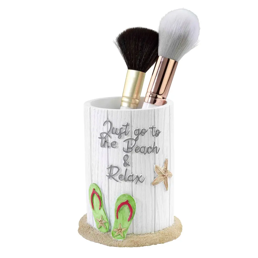 The Avanti Beach Mode Collection Tumbler says "just go to the beach and relax" on a white shiplap ground. Made of durable, hand-painted resin, a pair of green flip-flops, a starfish and a base made of realistically-looking sand finish the look. Coordinating pieces available.