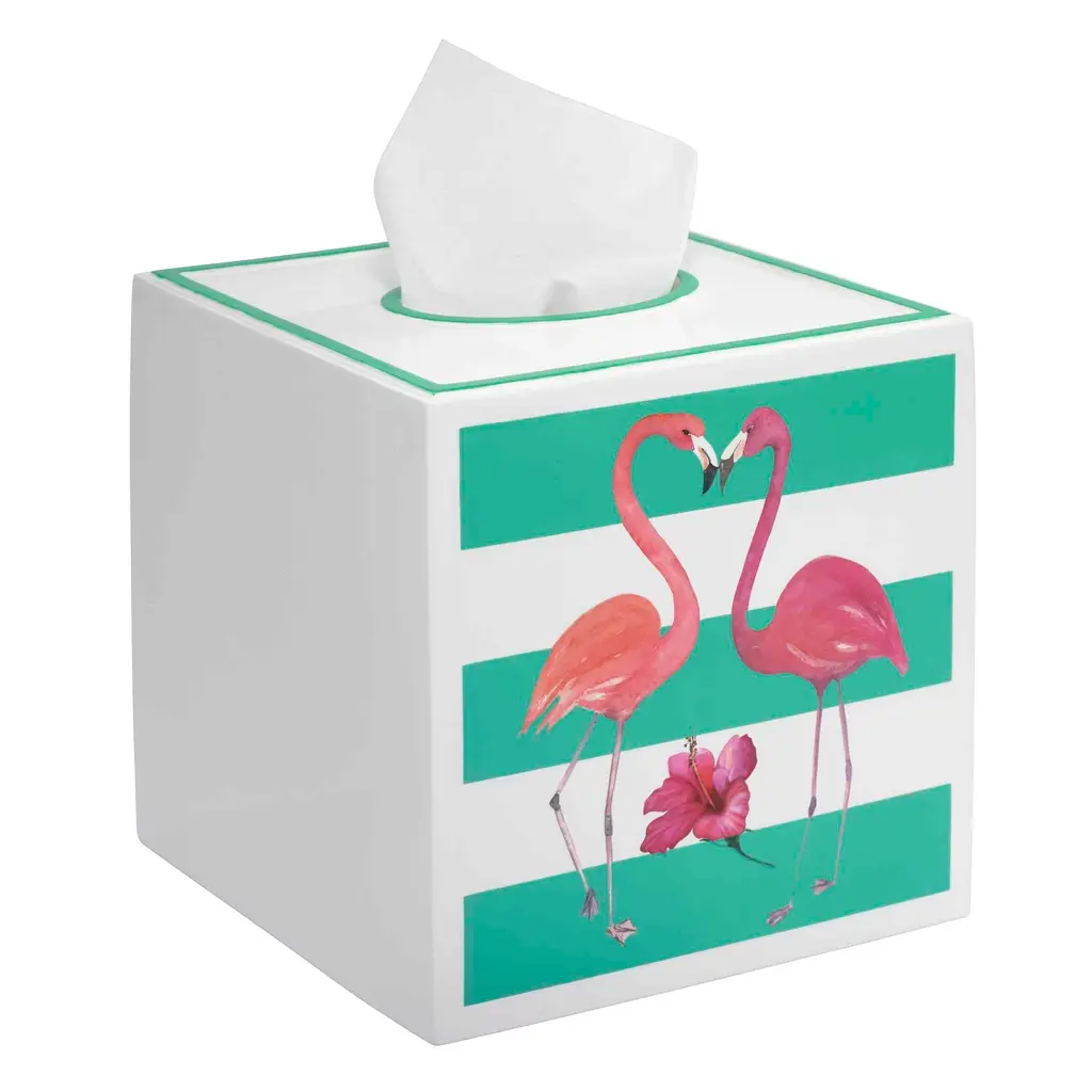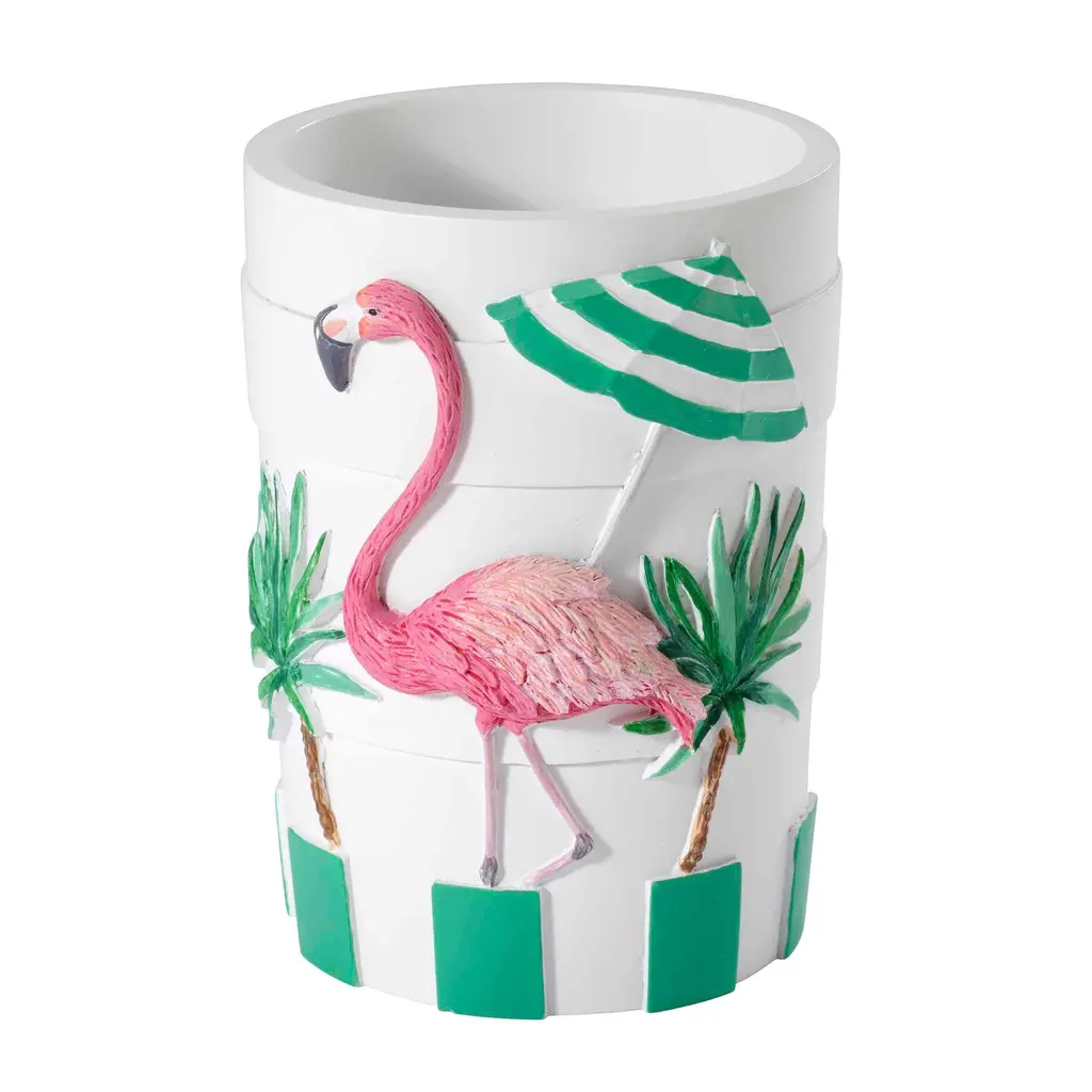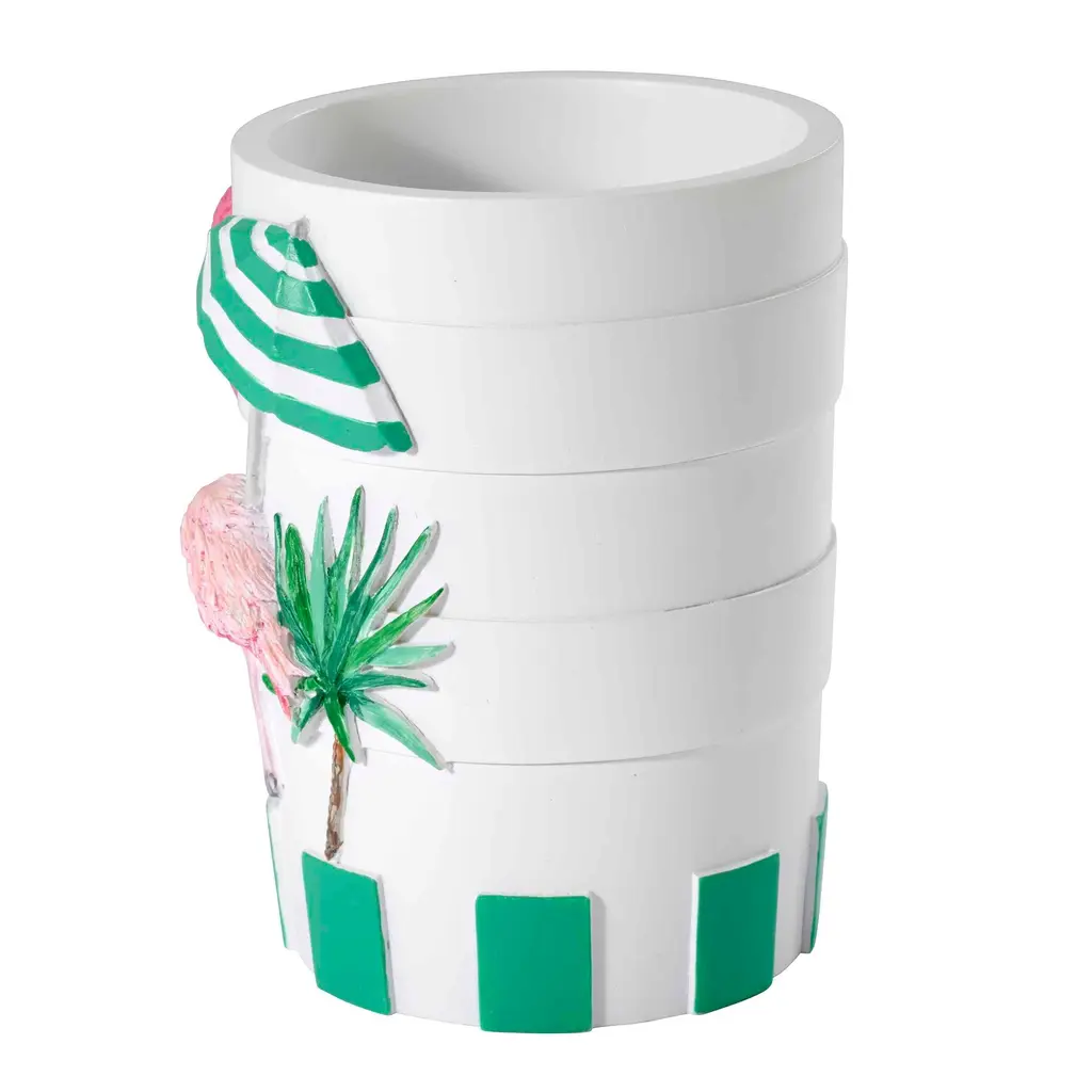 The Avanti Flamingo Paradise Tumbler features a 3-dimensional pink flamingo, palm trees and green and white striped umbrella. The smooth white background mimics shiplap and the bottom border is alternating vertical green and white stripes. Made of durable, hand-painted resin for easy care.