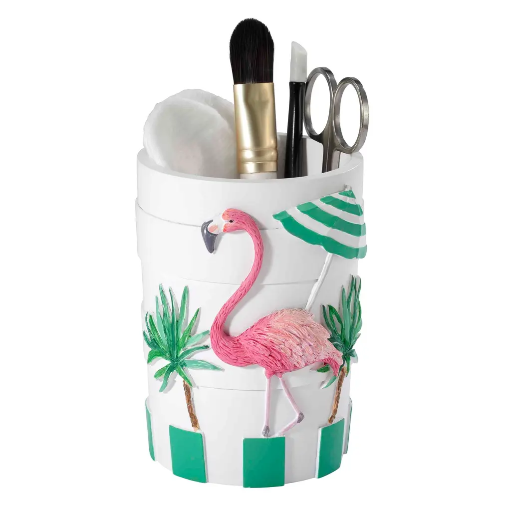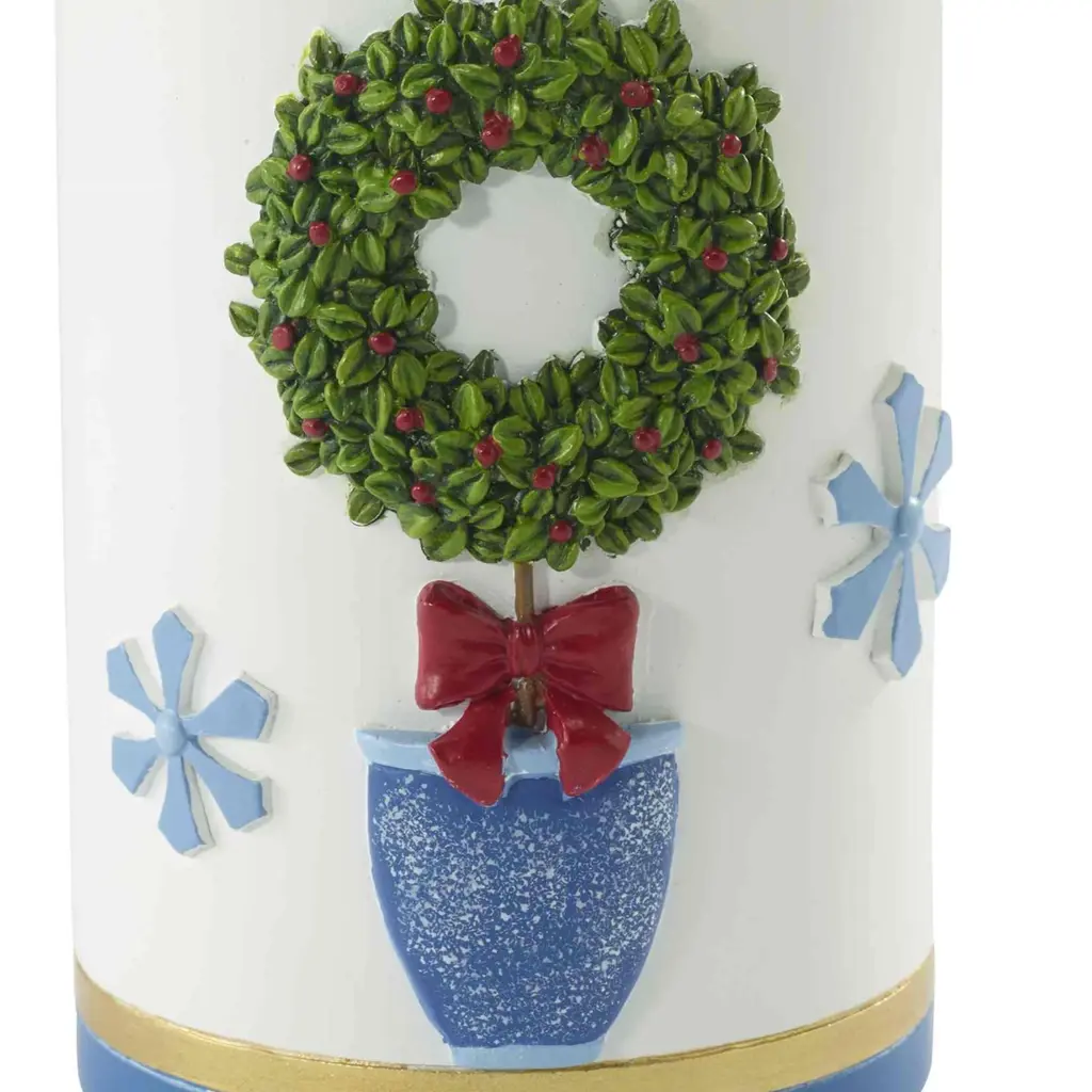 The Avanti Nutcracker Trellis Tumbler features a dimensional holiday wreath topiary with a red bow in a blue speckled pot. Blue and gold bands circle the bottom and blue snowflakes on the white ground add a nice touch. Made of durable, hand-painted resin.