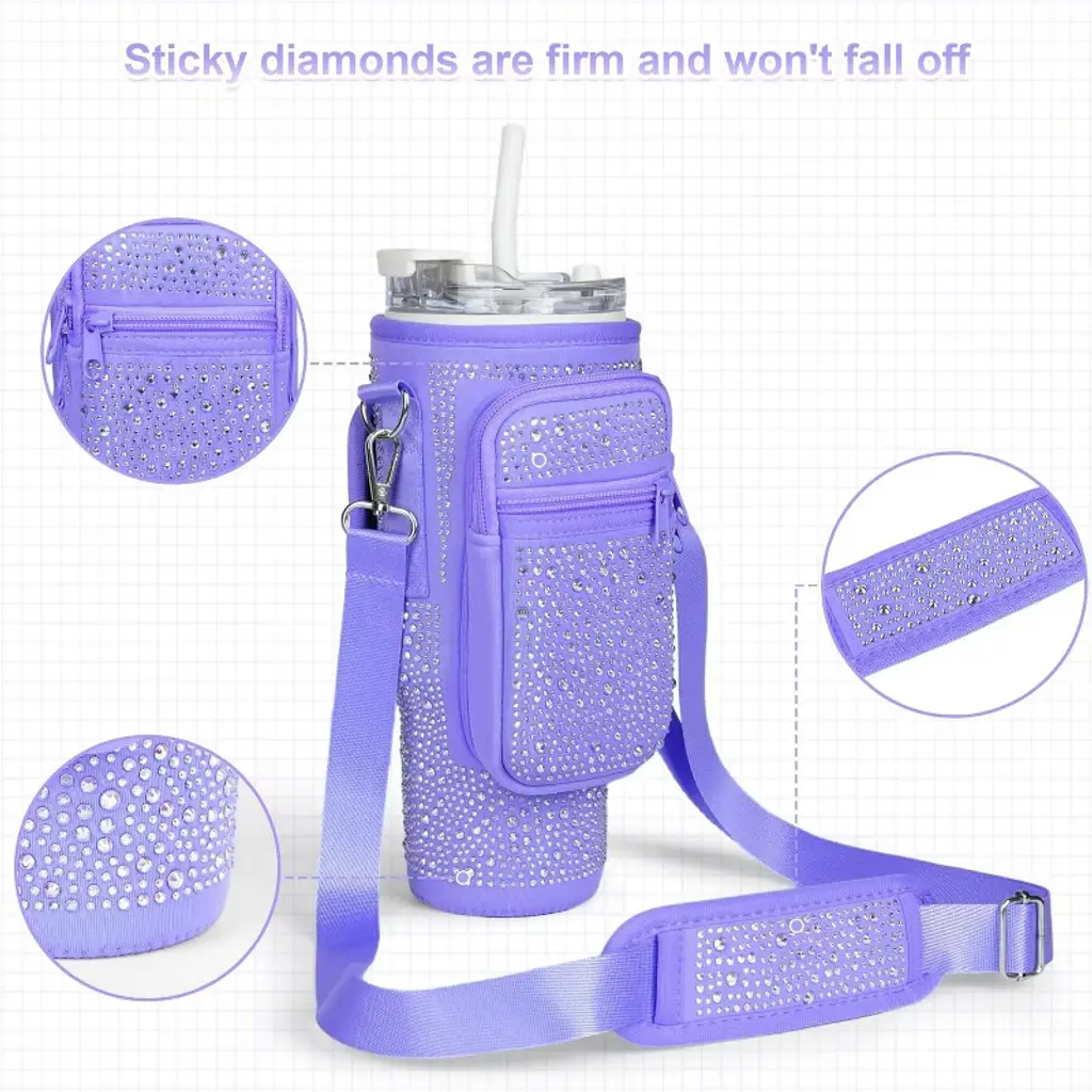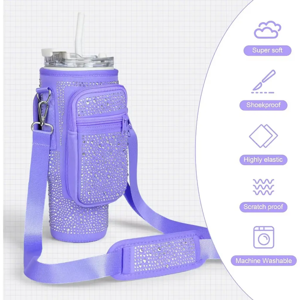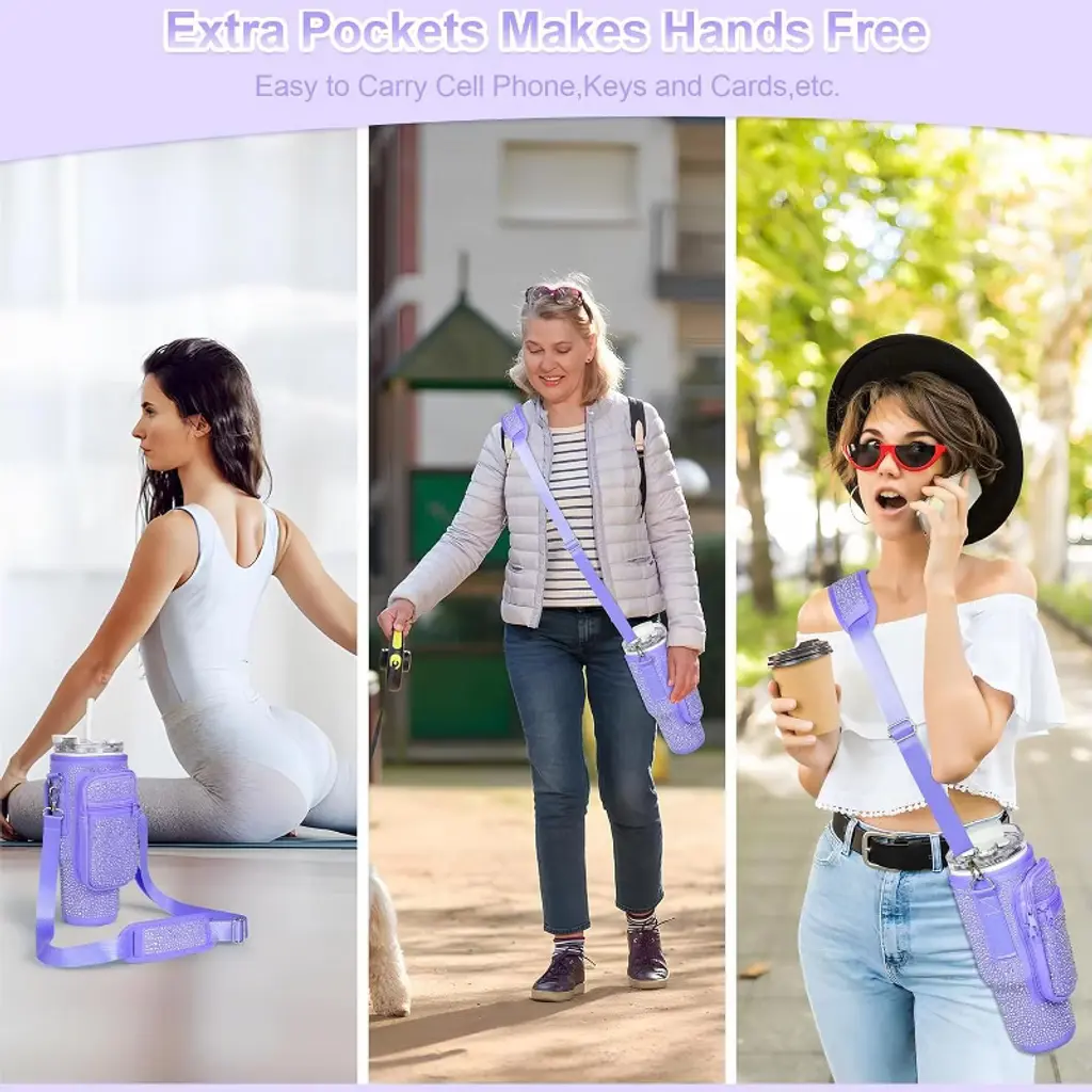 his 40 oz Cup Sleeve comes with adimond removable and adjustable shoulder strap, the shoulder strap can be easily adjusted between 28-53inch to fit a wide range of body shapes. It can hand carrying and crossbody.This water bottle holder designed with two pocket designs that provide plenty of room for all your personal belongings like phones, cash, cards,keys.
