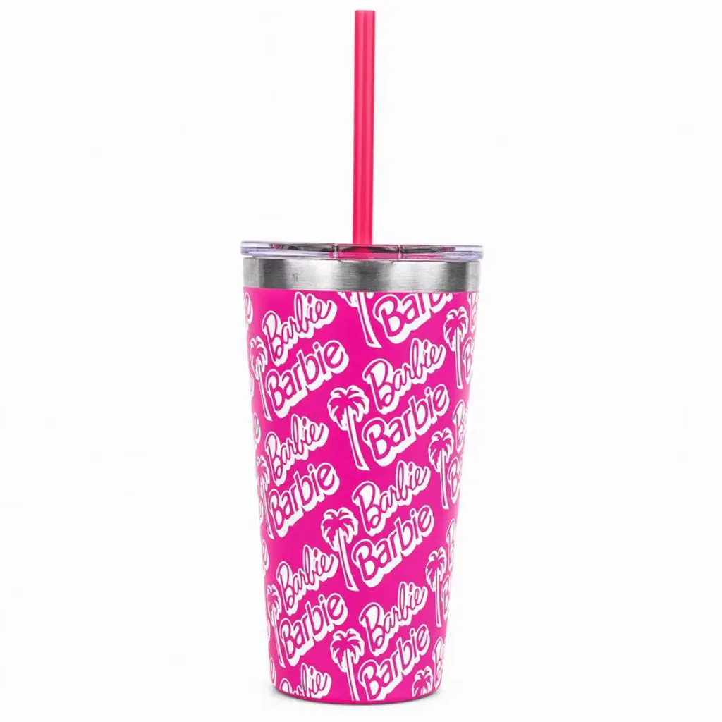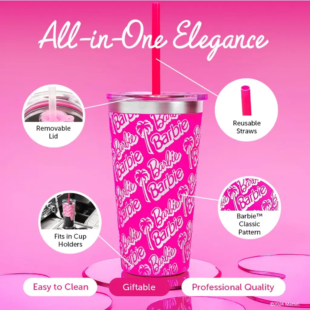 Insulated Stainless Steel Travel Tumbler: This 16-ounce stainless steel insulated water tumbler with straw turns your everyday beverage into a fashion statement. The insulated coffee tumbler comes with a removable lid, a charming pink straw, and a clear straw; offering options to match your style. Imprinted with the Barbie signature logo, this pink tumbler with straw lets you flaunt your love for the iconic brand, making it an instant classic.
