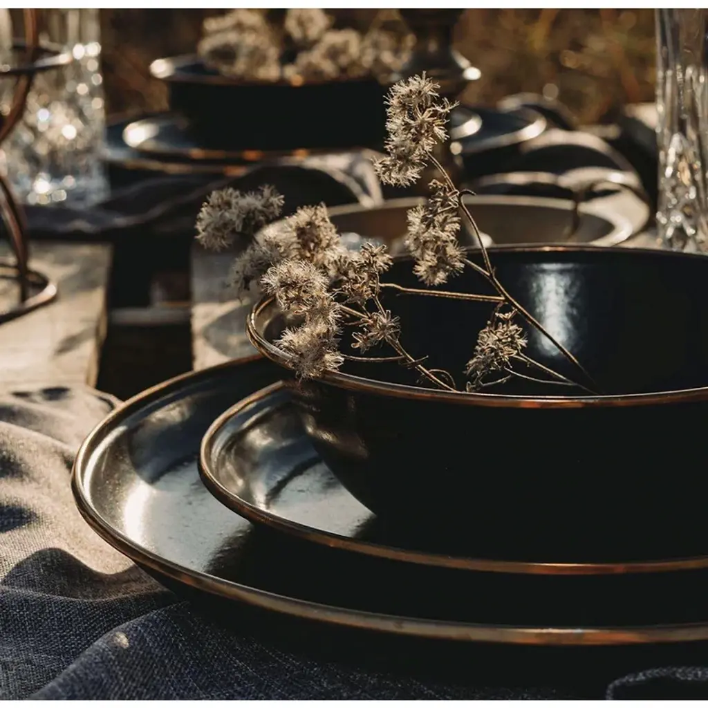 Charcoal is a beautiful, rustic, dusky gray-black that evokes a sense of warmth and looks handsome both indoors and outside.Each item features a speckled enameled surface with hand-finished baked stainless steel trim creating a bronze-like patina finish, resulting in unique pieces that form a cohesive set.Hand wash only. Do not microwave.Each product sold as set of 2.