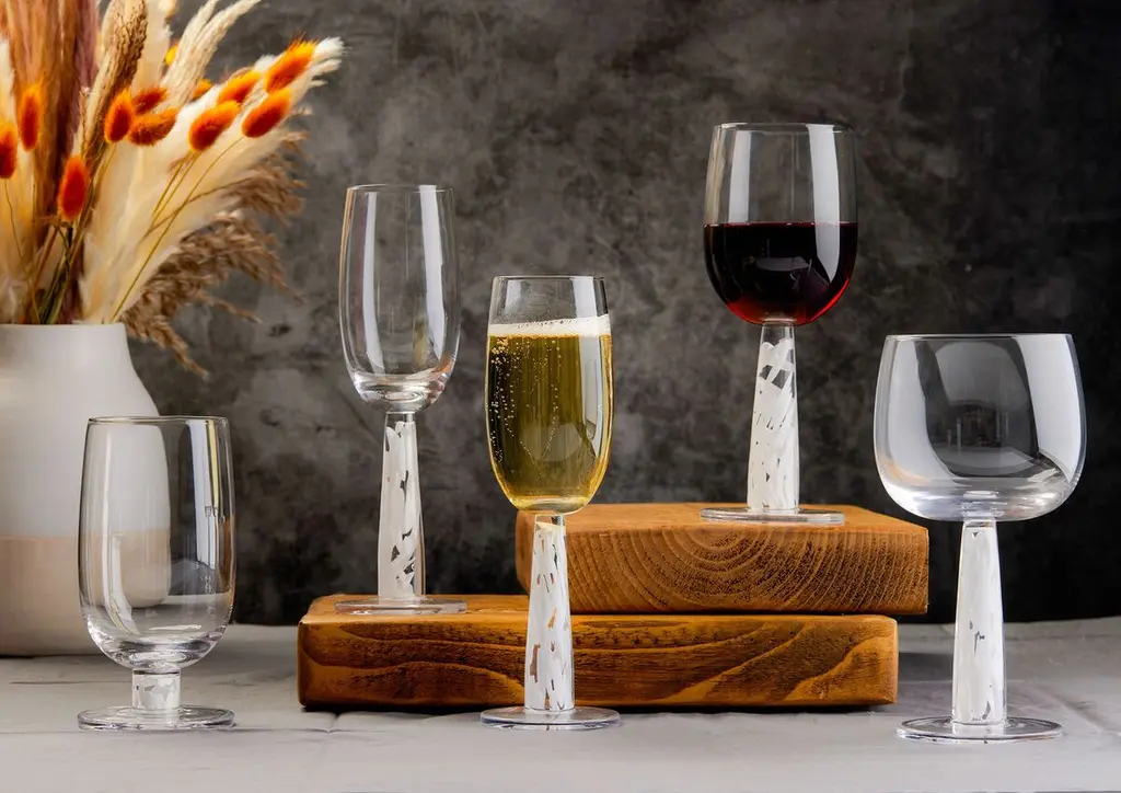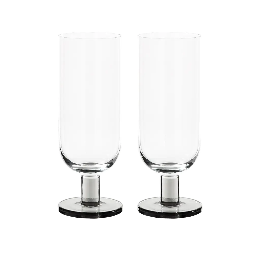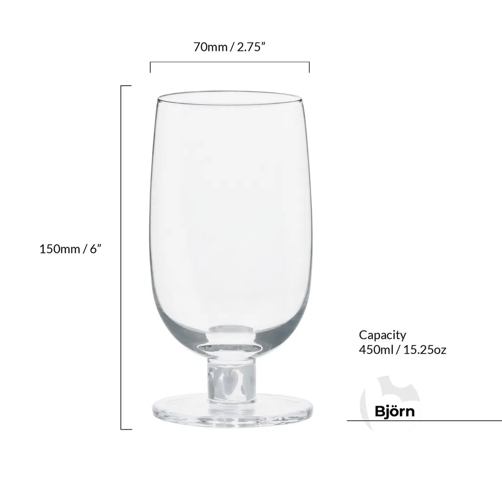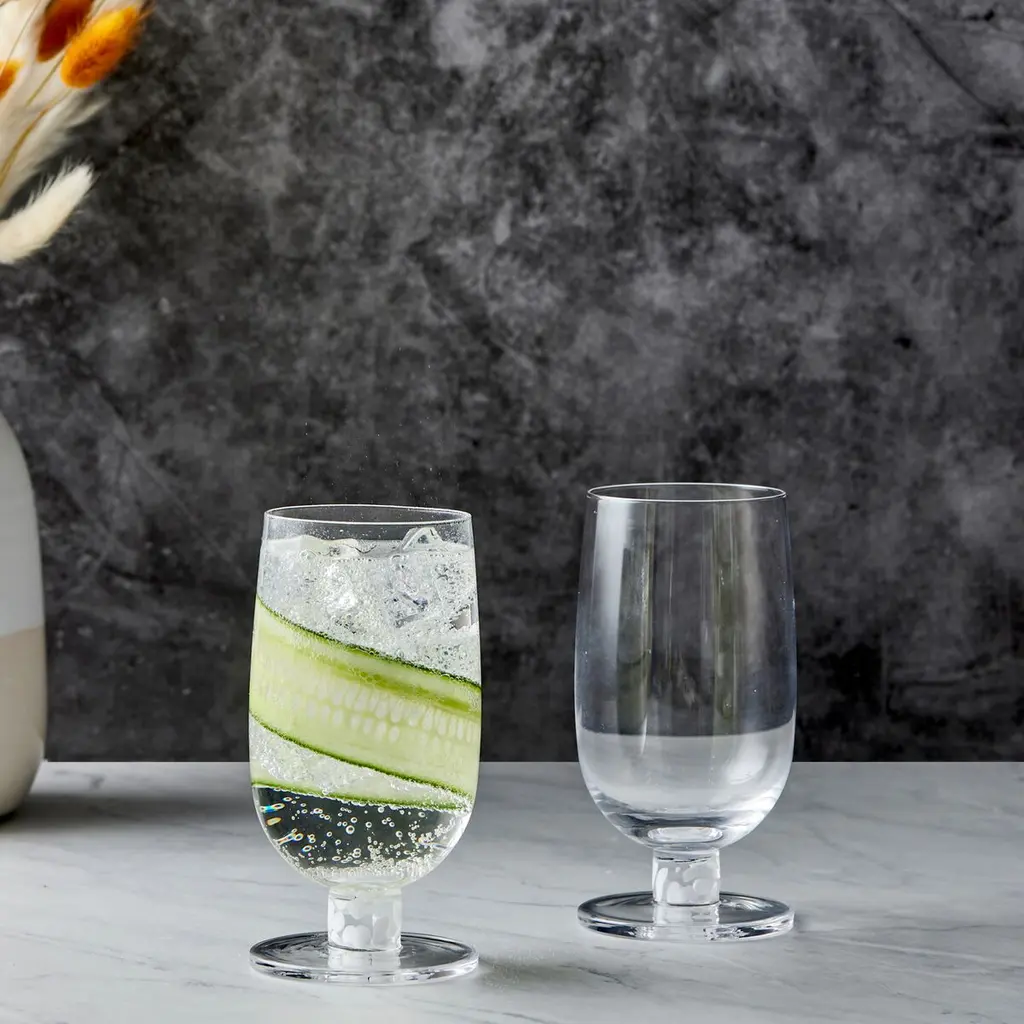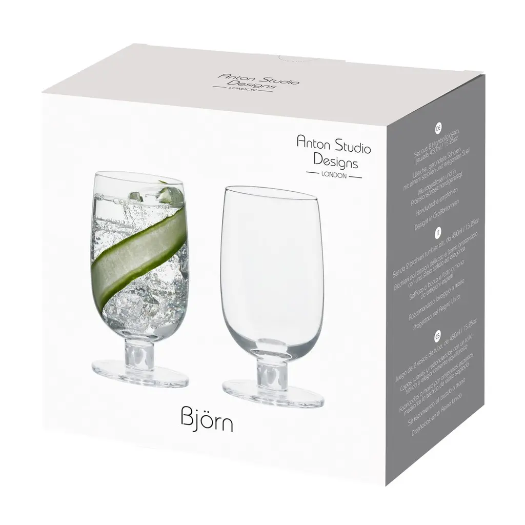 Enjoy your favorite gin cocktails with the contemporary Set of 2 Björn Gin Glasses. The set features a sleek Scandi style with clean lines, well-rounded bowls, and a thick stem and foot plate. Made from a single column of solid glass, and is decorated with white glass chips, to give each one a unique look creating Björn's signature design. The gift boxed set is beautifully weighted and tactile, making it a perfect gift for gin enthusiasts.